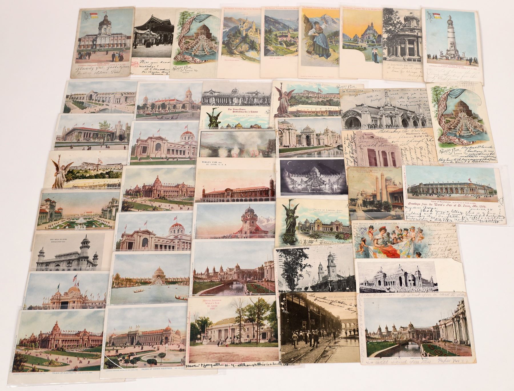 Lot of 44, St Louis World's Fair and Louisiana Purchase Expo 1904 exhibit Post Cards. Pre-split. Three are imprinted "POST CARD, authorized by an act of Congress May19, 1898". Of the postmarked cards, five have the expo 1904 commemorative stamp of which one has not been cancelled. Postmarks i.e.; N.Y., St Louis, Los Angeles, Mount Bethel PA., Pittsburg PS., Wantach N.Y.,