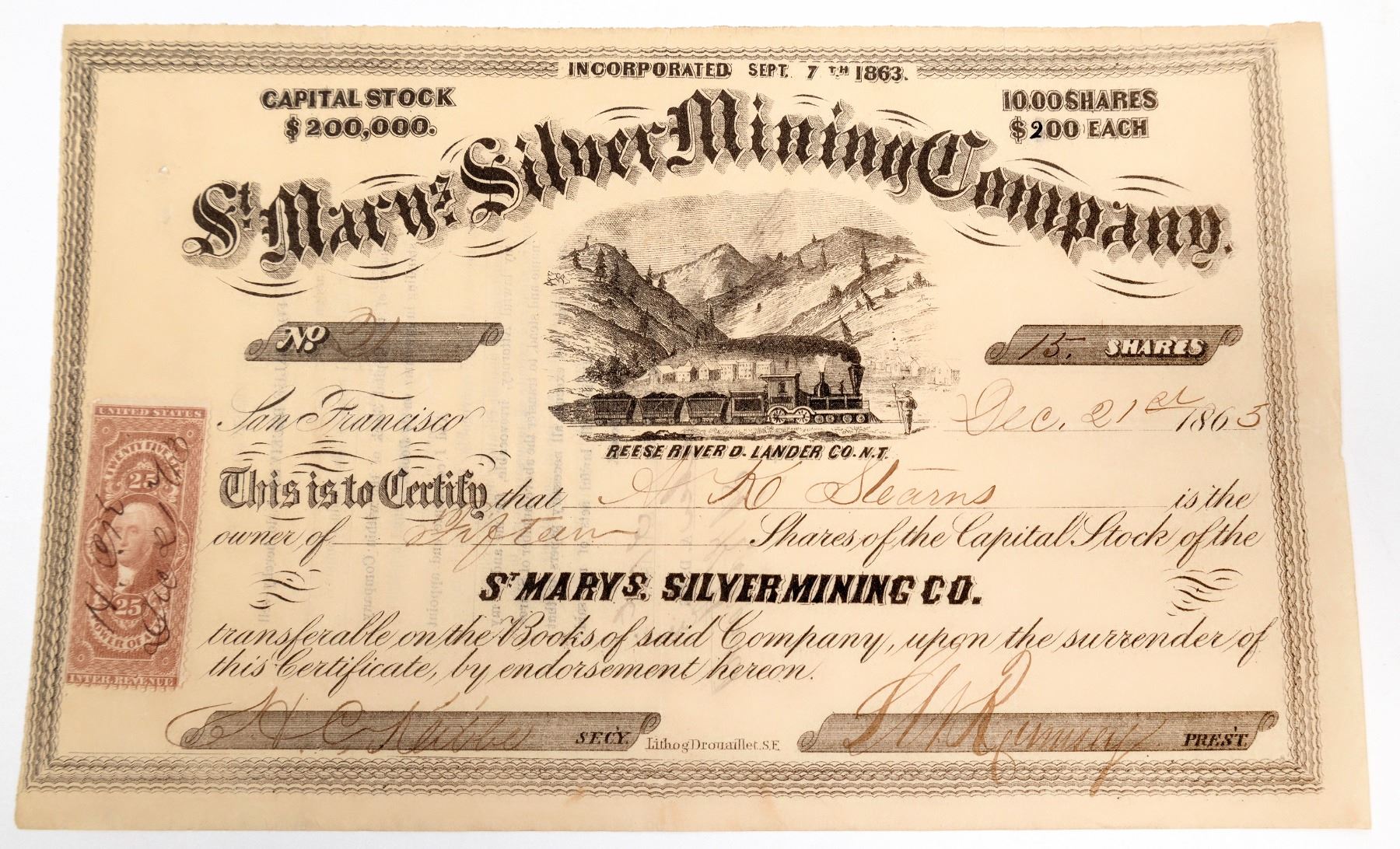 Strange vignette since there was no railroad at Reese River! # 21 for 15 shares to A. K. Stearns. Signed by H. C. Keibbe and president Ramsey (Rumsey). Issued. These are often not issued. Not cancelled. Dateline San Francisco Dec. 21, 1865. Incorporated Sept. 7, 1863. Located Reese River D. Lander. Co. N. T. Vignette of locomotive in mountain valley. Lithog Drouaillet, New York Printers. Interesting vignette since it would be many years before a railroad actually reached Austin and the Reese River Valley. A. K. Stearns was a prolific Reese River investor and promoter. Historical notes on Stearns included.