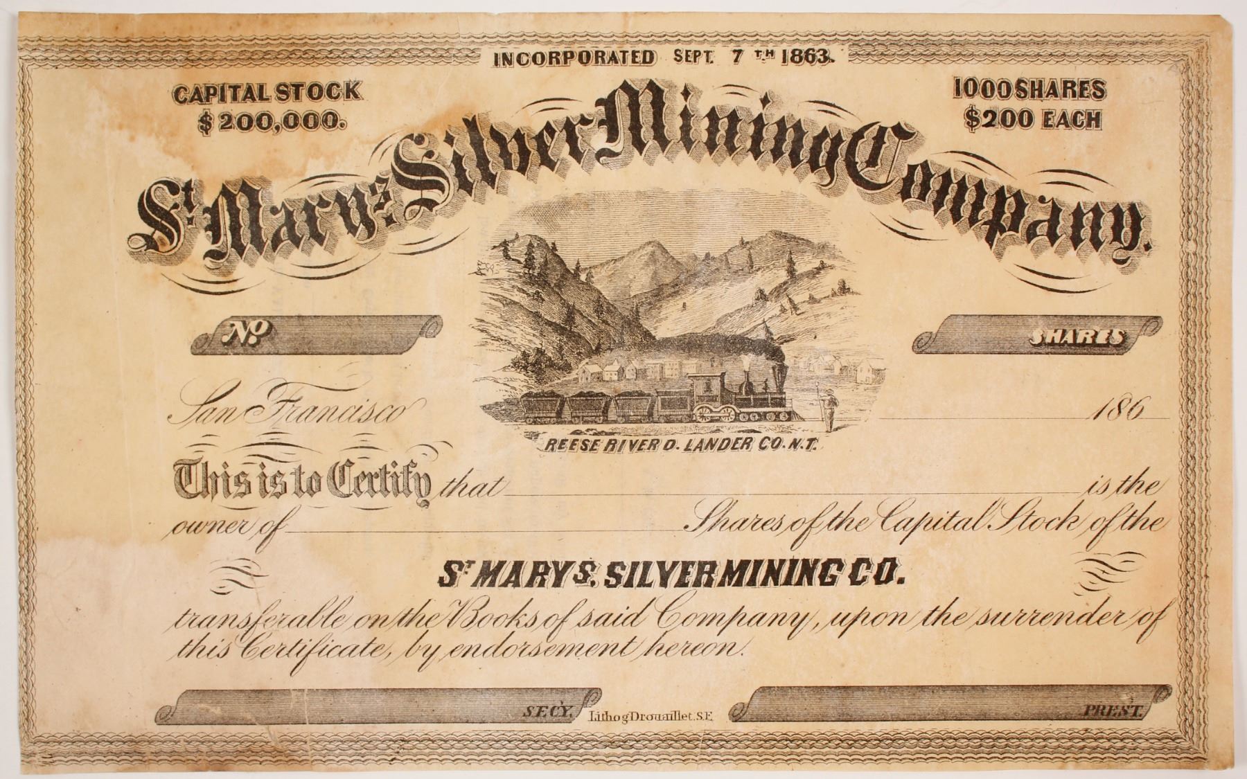 Unissued. Incorporated Sept. 7, 1863. Located Reese River D. Lander. Co. N. T. Vignette of locomotive in mountain valley. Lithog Drouaillet, New York Printers. Datelined San Francisco. Interesting since it would be many years before a railroad actually reached Austin and the Reese RIver Valley. City: Reese River State: Nevada Date: 186- HWAC# 80359