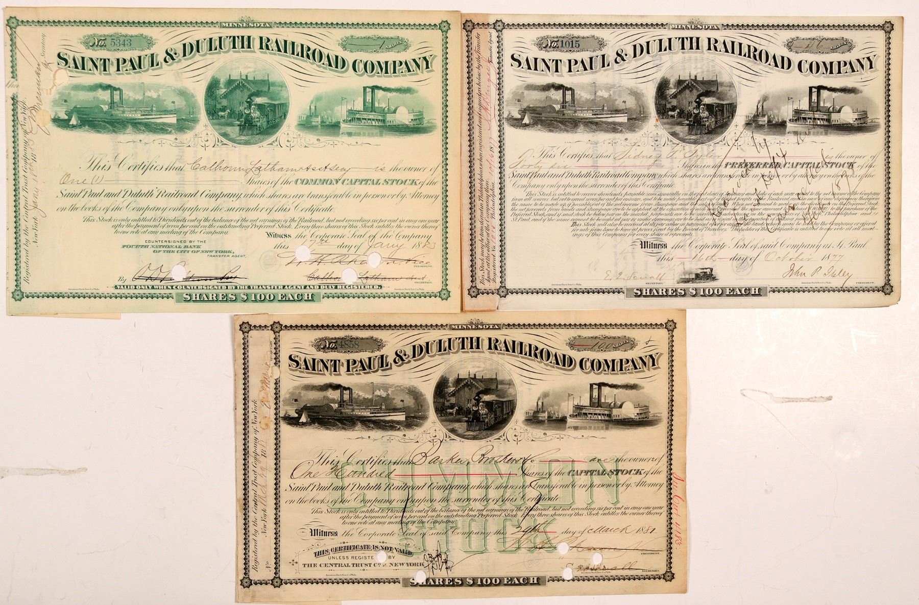 3 cancelled stock certificates for St. Paul & Duluth Railroad Co @ $100 each share. Inc. in Minnesota. Vignettes on top 1) left and right is steam boat 2) center is train in station. Registered. 2 Assigned. Printed: American Bank Note Co. St. Paul and Duluth Railroad was reorganized from Lake Superior and Mississippi Railroad in 1877. Bought by the Northern Pacific in 1900. Operated from St. Paul to Duluth, Minnesota, with branches to Minneapolis, Taylors Falls, Kettle River, and Cloquet, in Minnesota, and Grantsburg and Superior in Wisconsin. Purchased by Northern Pacific Railway. That was succeeded by Burlington Northern, then the Burlington Northern Santa Fe. After mergers most of the lines were redundant and abandoned.