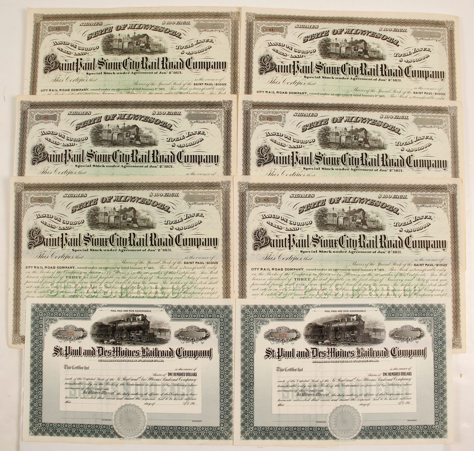 Nine unissued stock certificates two for St. Paul and Des Moines Railroad Company & seven for Saint Paul and Stone City Rail Road Company . 1) Number 674 with railroad engine vignette. 2) Number 673 with railroad engine vignette. Printed: Franklin-Lee Bank Note Company. 3) Number 87 with train vignette. 4) Number 79 with railroad engine vignette. Printed: Snyder Black & Sturn 5) Number 81 with train vignette. Printed: Snyder Black & Sturn 6) Number 78 with train vignette. Printed: Snyder Black & Sturn . 7) Number 85 with train vignette. Printed: Snyder Black & Sturn . Printed: Franklin-Lee Bank Note Company. 8) Number 75. 8) Number 75 with train vignette. Printed: Snyder Black & Sturn . Ken Prag Collection. State: City: Date: HWAC# 78746