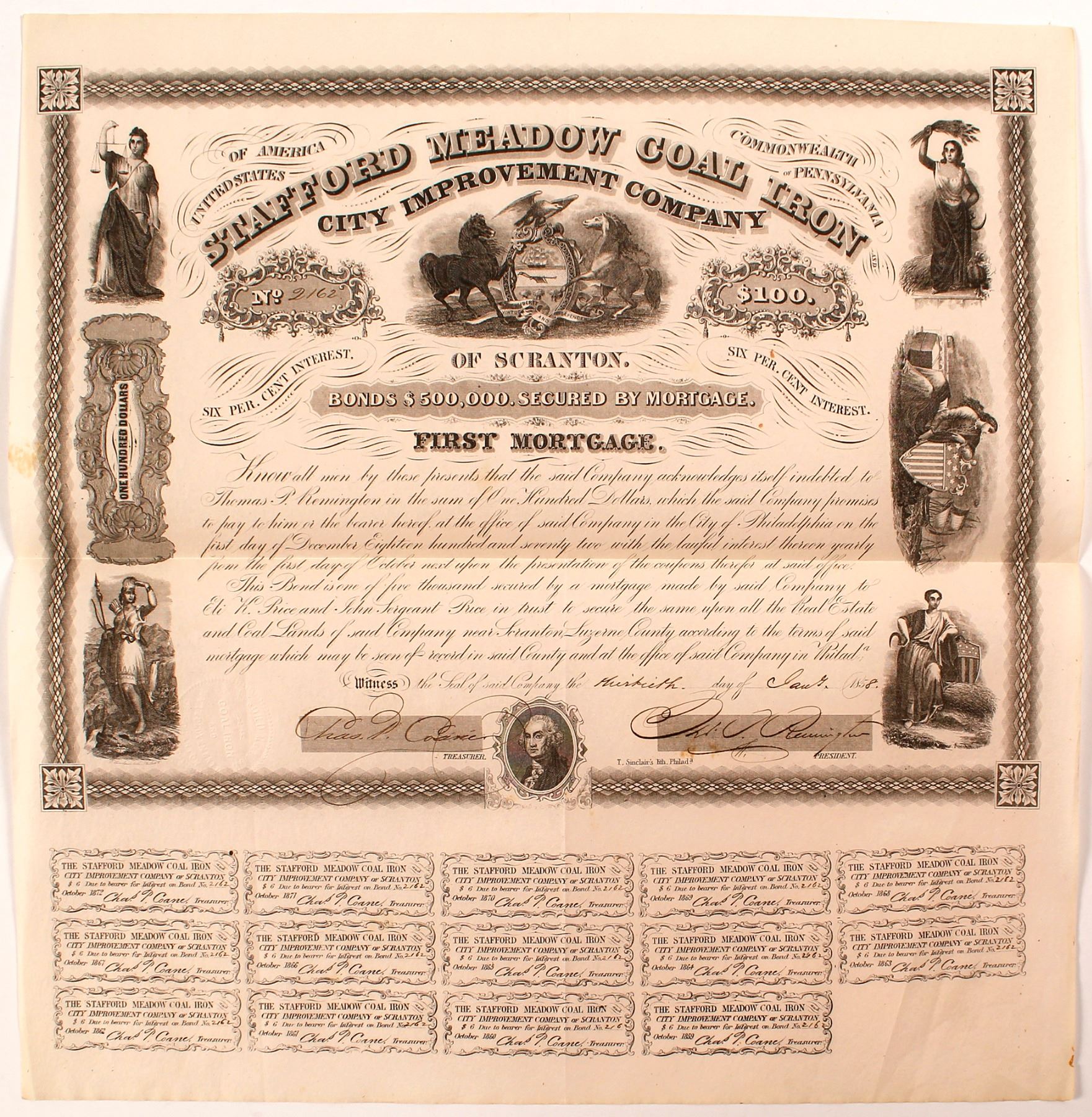 Bond Secured by Mortgage. Revealed Six Percent Interest. Issued 1858. 7 vignettes in the border one with a black horse and white horse, eagle, woman holding set of scales, two soldiers, a woman with ships in background, and another with a woman looks to be harvesting wheat. Nice condition. 15" x 14.75".