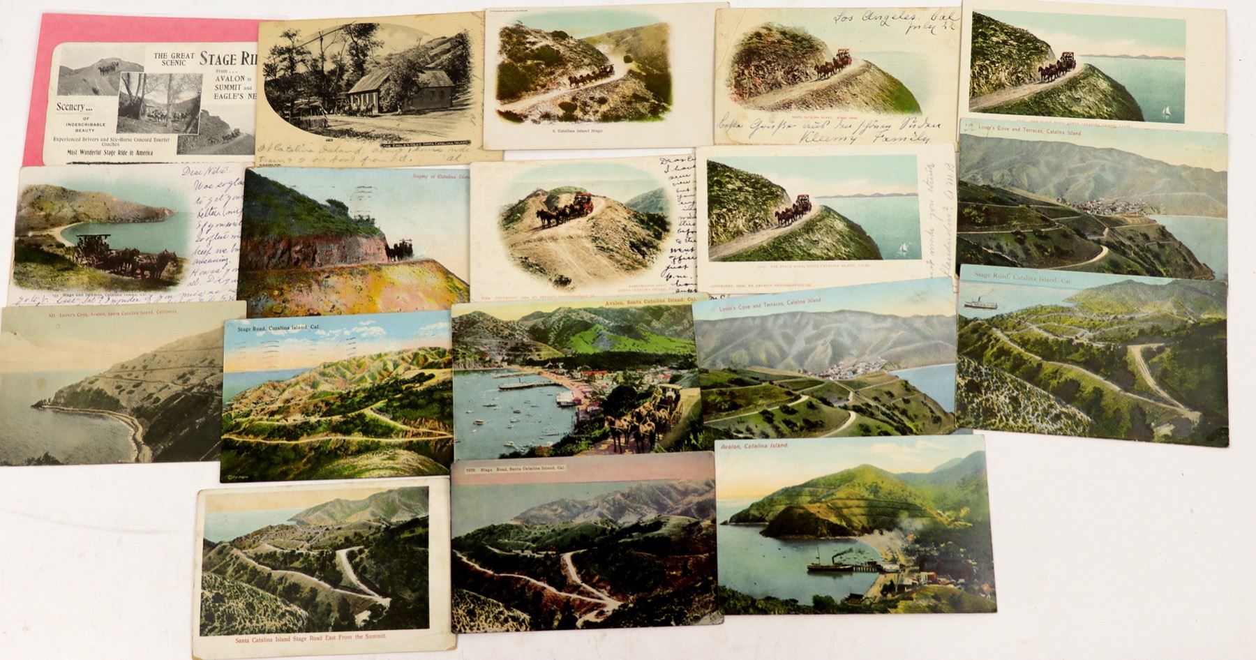 Lot of 18. Eight postmarked 1901-25. : L.A. San Fran, Cheltenham PA, Whittier CA, Avalon. There are three PMC, one has 1 cent East Lake Navigation stamp. Stage Ride ad card w/three scenes of the ride. Street level view: distant stage on at different points on road., Eagle Nest cabin. Birdseye view: Avalon w/stage road in background, several views of the road, photo of stage w/Avalon background..