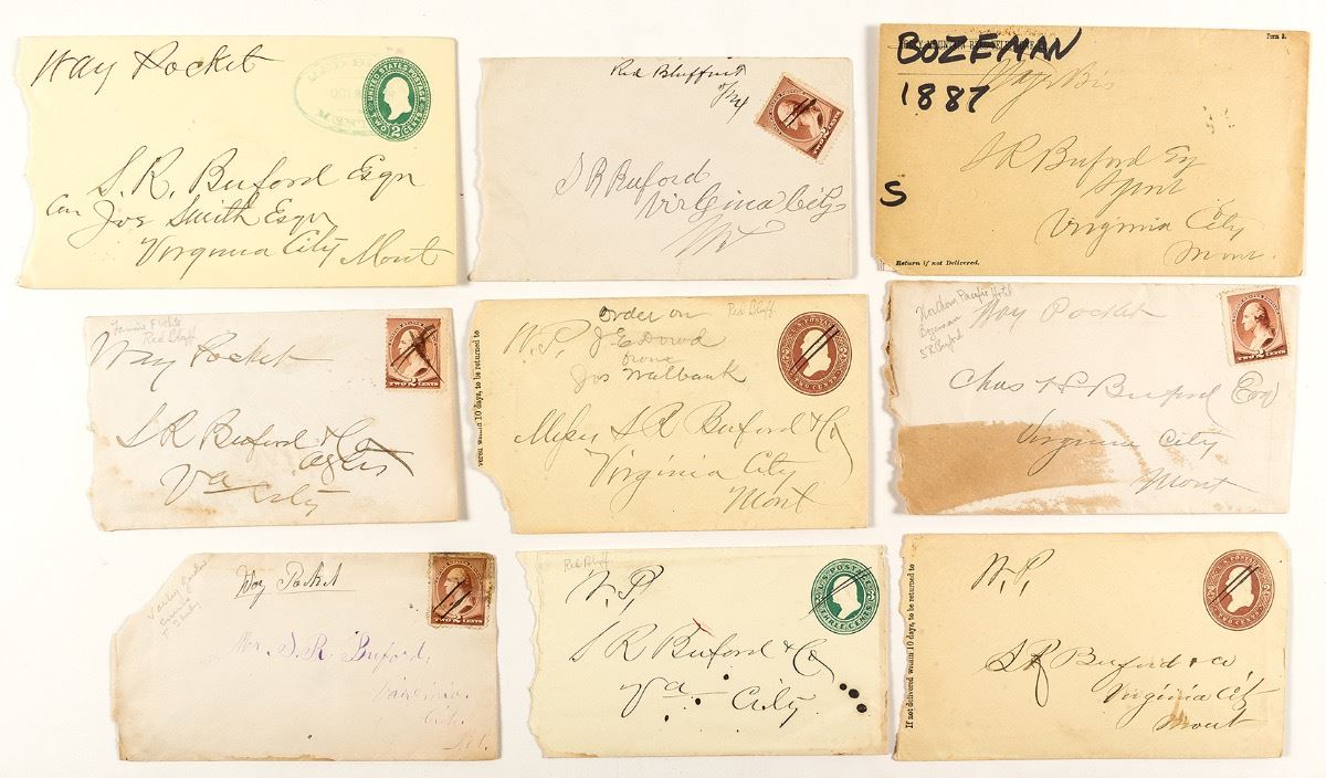 Lot of nine. 1) From T Shirley at Valley Garden - possibly Valley Garden Ranch in Madison County 2-3) Bozeman. One from Northern Pacific Hotel. One has been marked on. 4-9) Red Bluff. One oval light green cancel. All are mailed to Buford in Virginia City. (Svoboda Collection) City: Red Bluff / Bozeman / Valley Garden State: Montana Date: 1880's HWAC# 35219