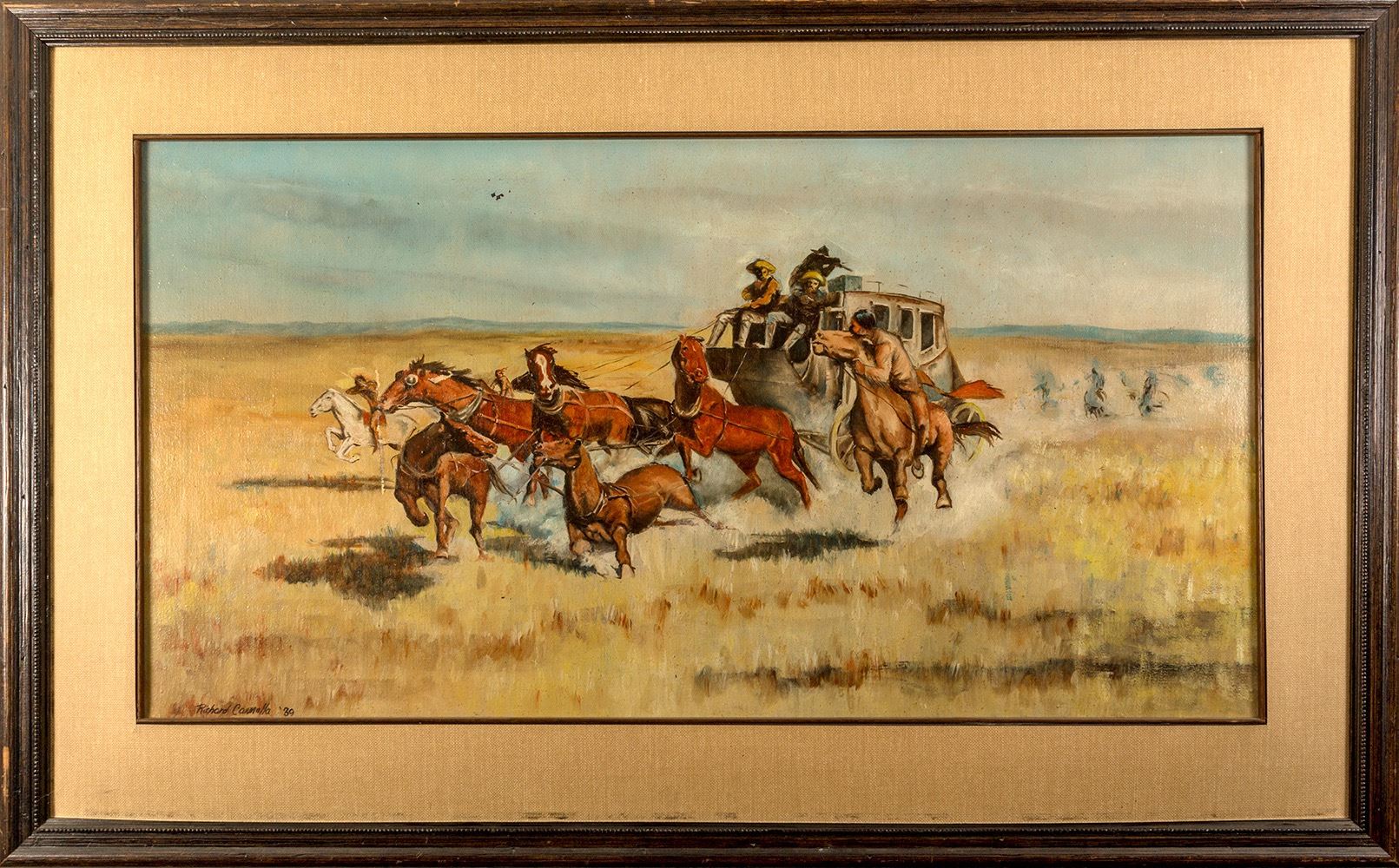 Stagecoach / Indians, oil painting by Richard Carmella. 18" x 34", framed 26" x 42". State: City: Date:1939 ID# 49739
