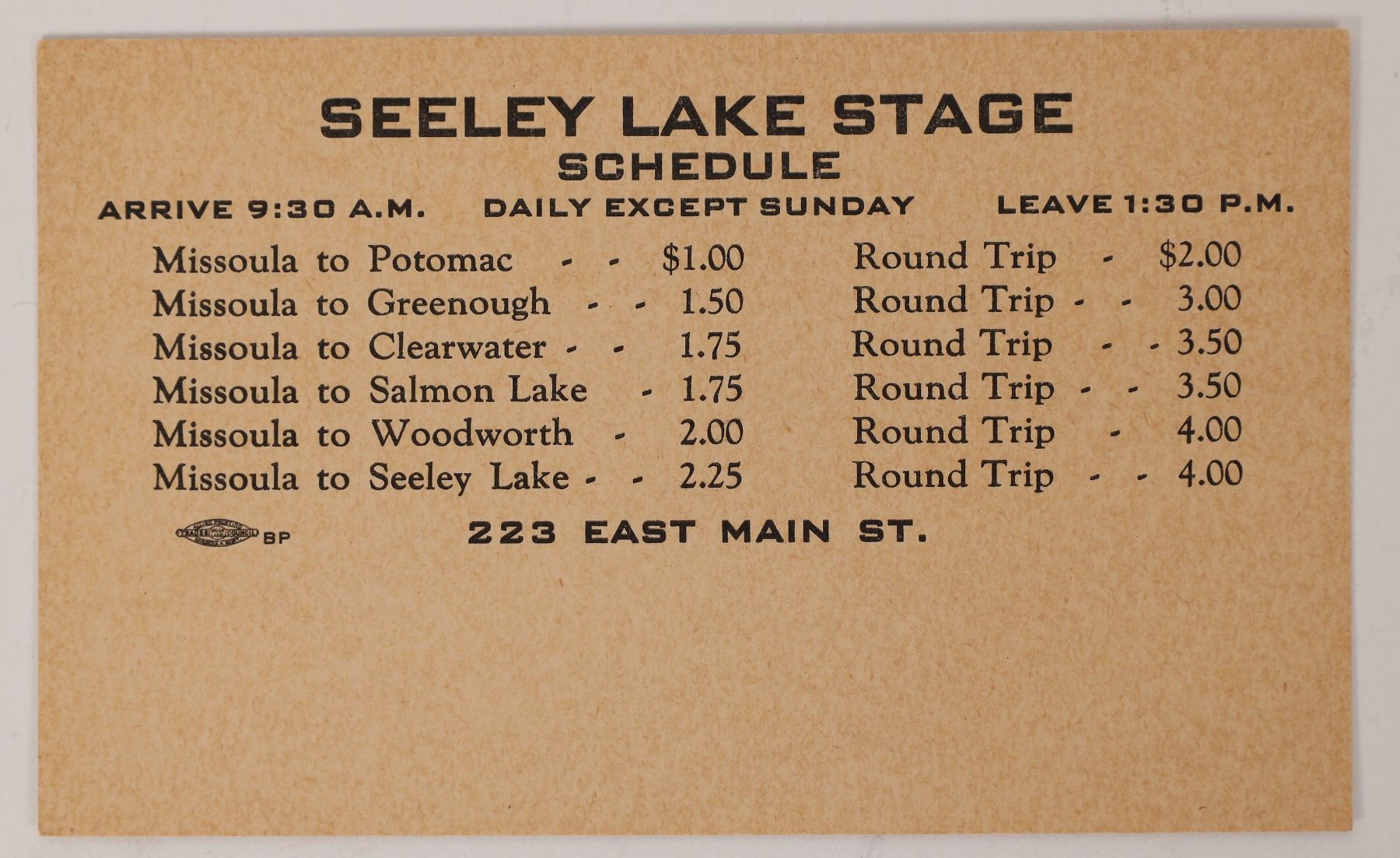 Old Stagecoach Schedule from Seeley Lake Stage. Arrive 9:30 a.m, Daily Except Sunday, Leave 1:30 p.m. Missoula to Potomac, Greenough, Clearwater, Salmon Lake, Woodworth, Seeley Lake.