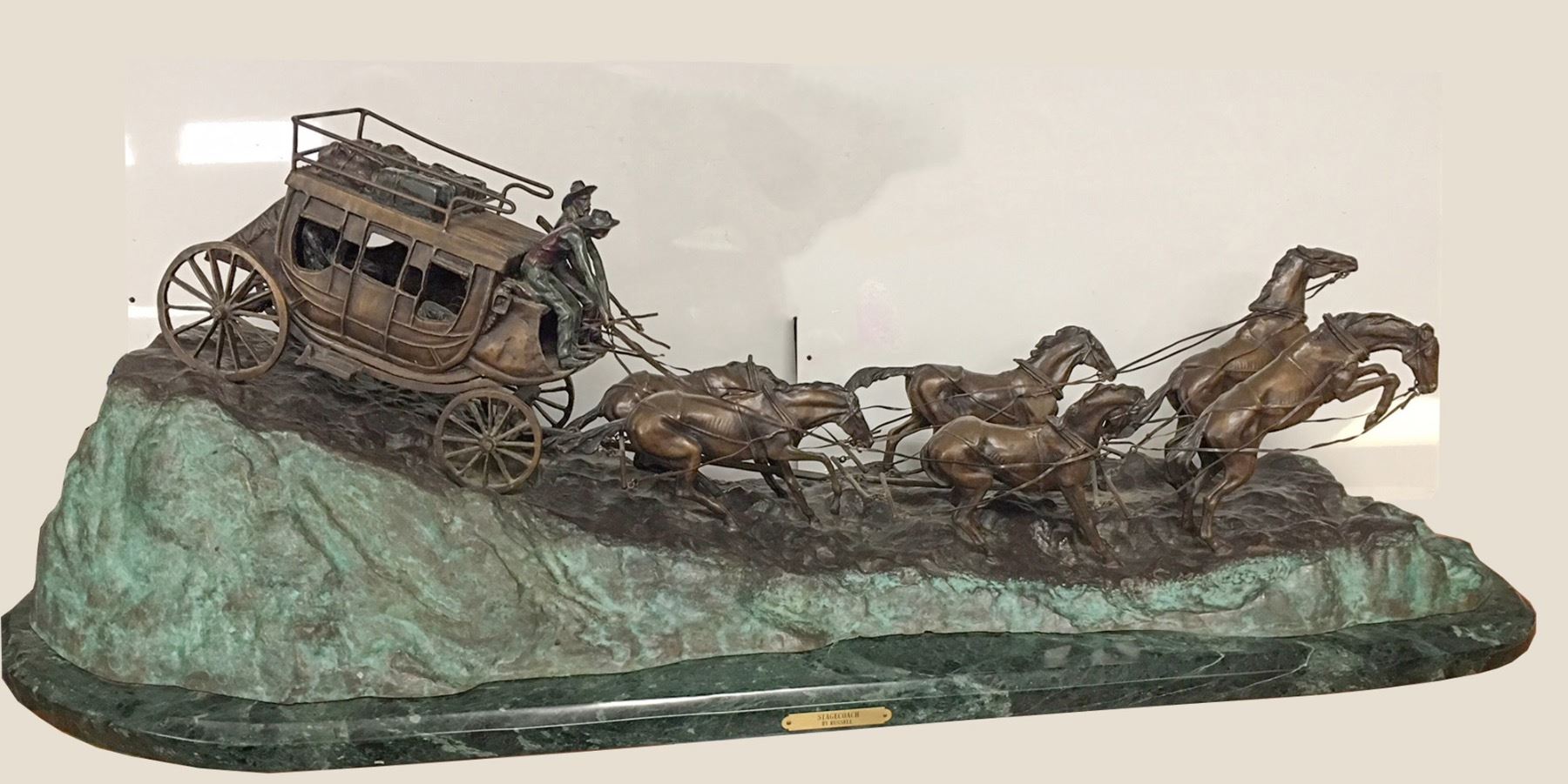 Bronze Stagecoach on Greenstone by Charles Russell. 20" x 45". Extremely high quality reproduction of Russell's famous stagecoach piece. An advocate of the Northern Plains Indians, Charles Marion Russell (1864-1926) was among many things a true American cowboy. As a night wrangler for the Judith Basin Roundup, Russell had time to observe the cowboys at work during the day, and to sketch and document all the activities and excitement of the cow camp. He continued to work as a cowboy and wrangler for 11 years before retiring to become a full-time artist. This museum quality bronze is hand casted in the traditional Òlost waxÓ method using the highest quality of bronze. The sculpture is one of a kind, handmade by highly talented artisans and attached to a beveled marble base with a gilded plaque of the bronze title and name of the artist. A beautiful classic patina is applied by hand to amplify definition and fluidity to the natural state of the bronze. The details are phenomenal É