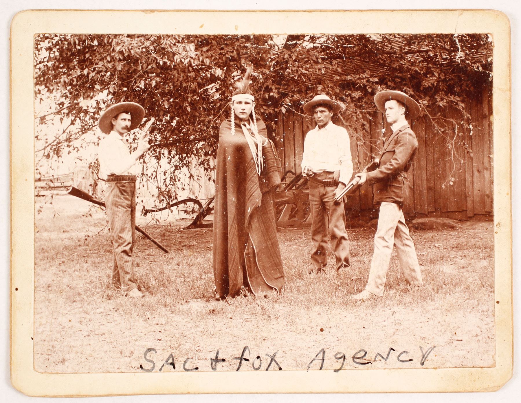 Small cabinet card (3.25 x 4.25" showing three armed men pointing their guns at a Native American. Definitely a stage photo. Has "Sas & Fox Agency" written in pen on the front. On the reverse, three men are identified and the date is given as 1897. Crease upper right. Minor wear. Nice contrast.