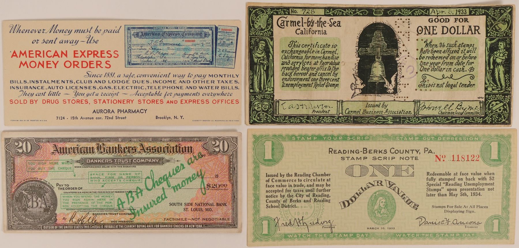 A trio of stamp scrip and a voided booklet of Amex money orders. All in good condition.