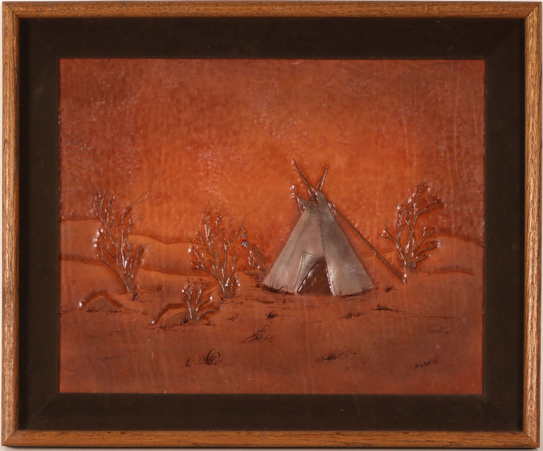 Unusual and impressive stamped leather painting of a tepee with a Native American holding a colorful staff. Leather is stamped and textured with front embossed teepee. Artist is known as Bo-Bec and is originally from Texas. Leather 15x19.5", frame 20x 24"