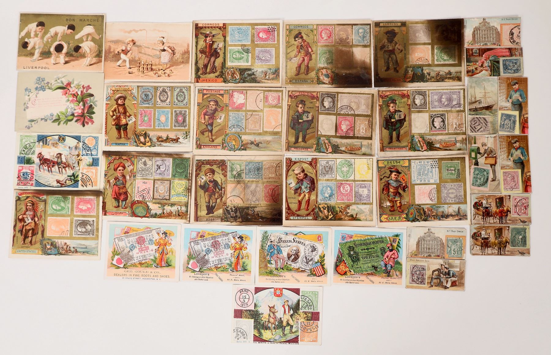 Stamps, stamp trading cards and advertising cards (27) make up this lot. The stamp trading cards are from Duke Cigarettes, a part of the American Tobacco Company. Dukes was forced to dissolve in 1911, after finding ATC in violation of restraint of trade laws. Cards are in good condition. Please see photos for more details. 1800s-1900s