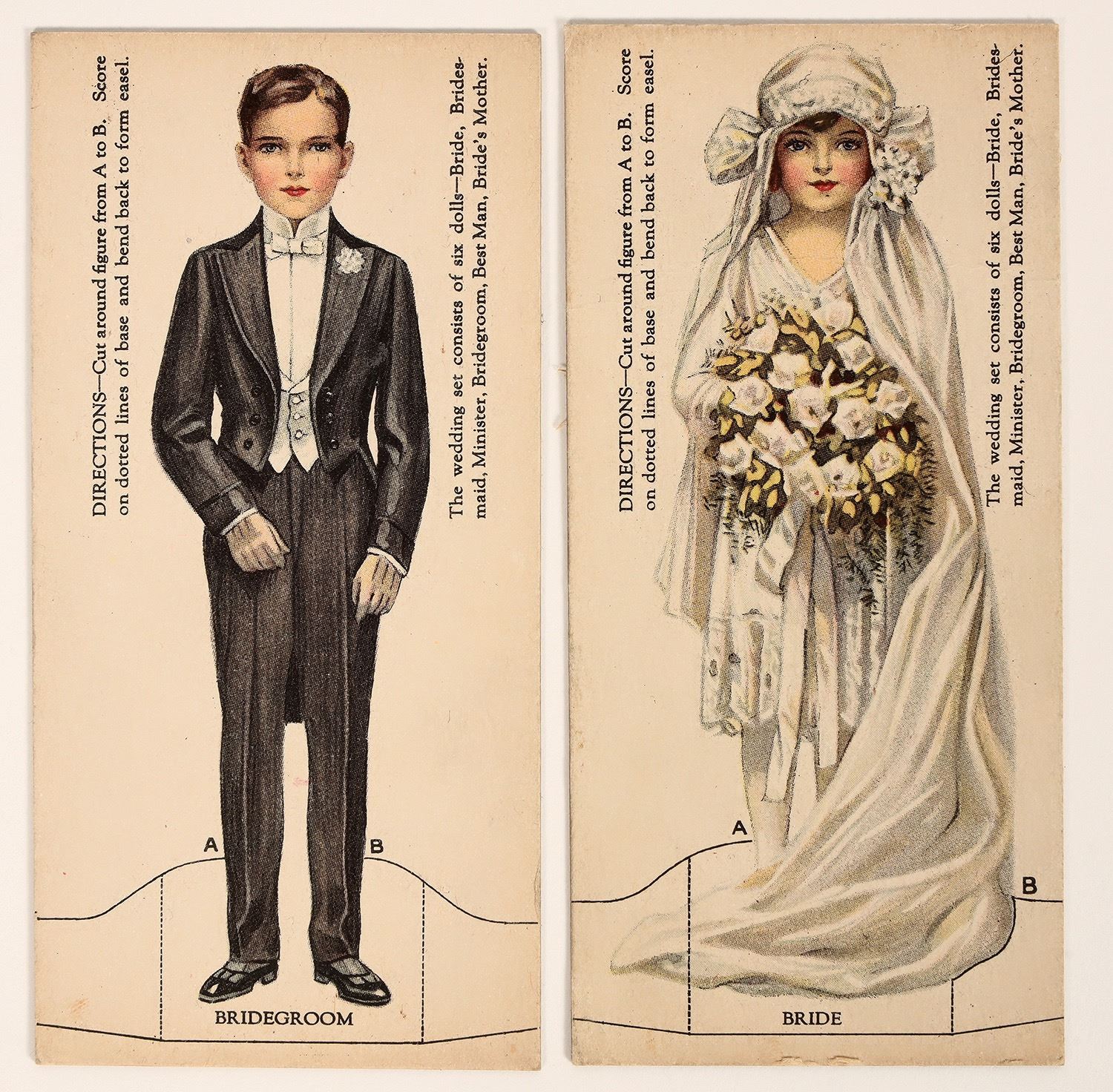 A bride & groom cutout cardboard doll set (2) given as a premium by J&P Coats or Clark's O.N.T. & The Spool Company. Pieces measure 5"x 2" & are in nice condition. Please see photos for more details. [New York City New York