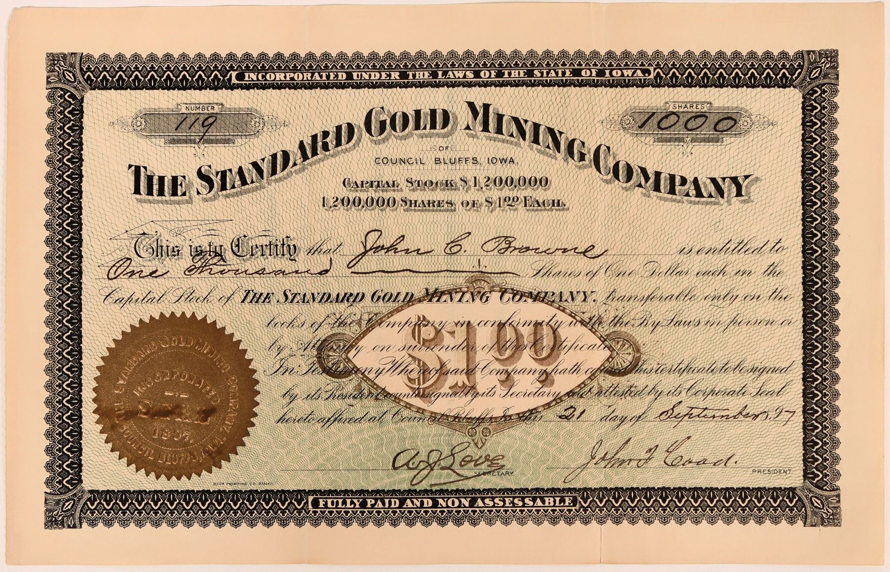 Of Council Bluffs, Iowa Stock, 1897. Inc. in Iowa. Cert. #119, issued for 1000 shares in 1897. We could find no reference to this company or its operations after much looking. Nice looking certificate. Fold split at bottom right fold. Uncanceled. Iowa 1897 Iowa