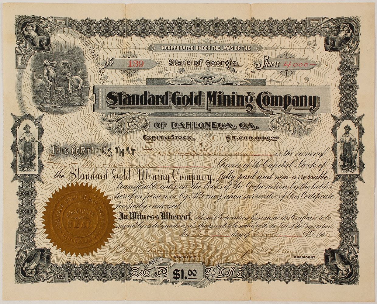 1900. Number 139 issued to Frank Stillman for 4,000 shares. Signed by secretary RC Thomson and president JW Adams. Seven small underground mining vignettes. Rips at folds and intersections. Vertical folds are heavy. Good condition. (Al Adams Gold Rush Memorabilia Collection) Date: Location: Dahlonega, Georgia HWAC# 56925