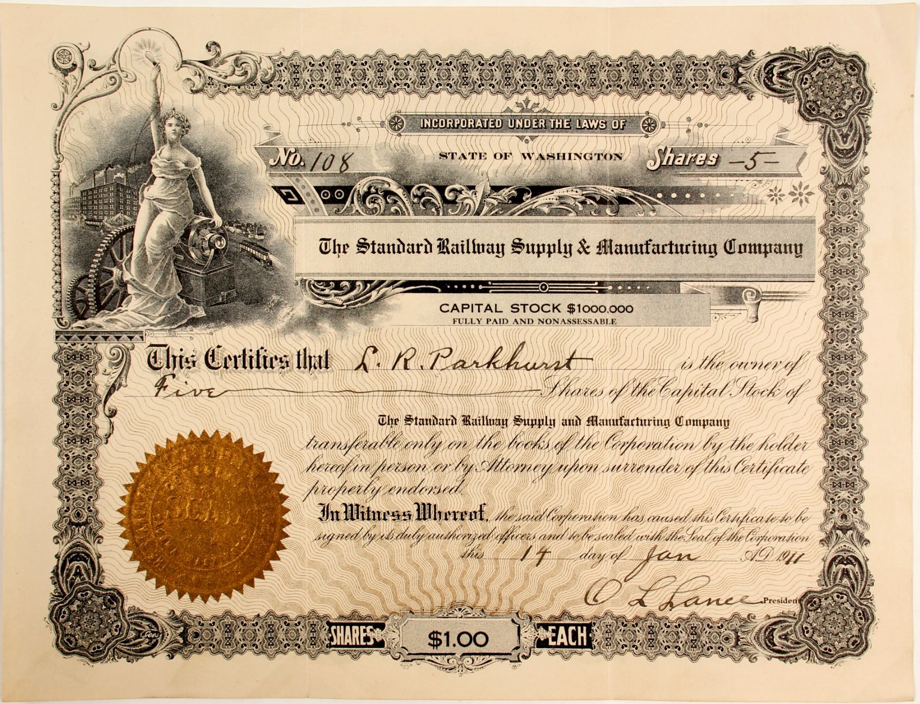 I/U #108 LR Parkhurst 5 shares 1911 signed by President Lance. Prag Collection. State: City: Date: 1911 HWAC# 84142