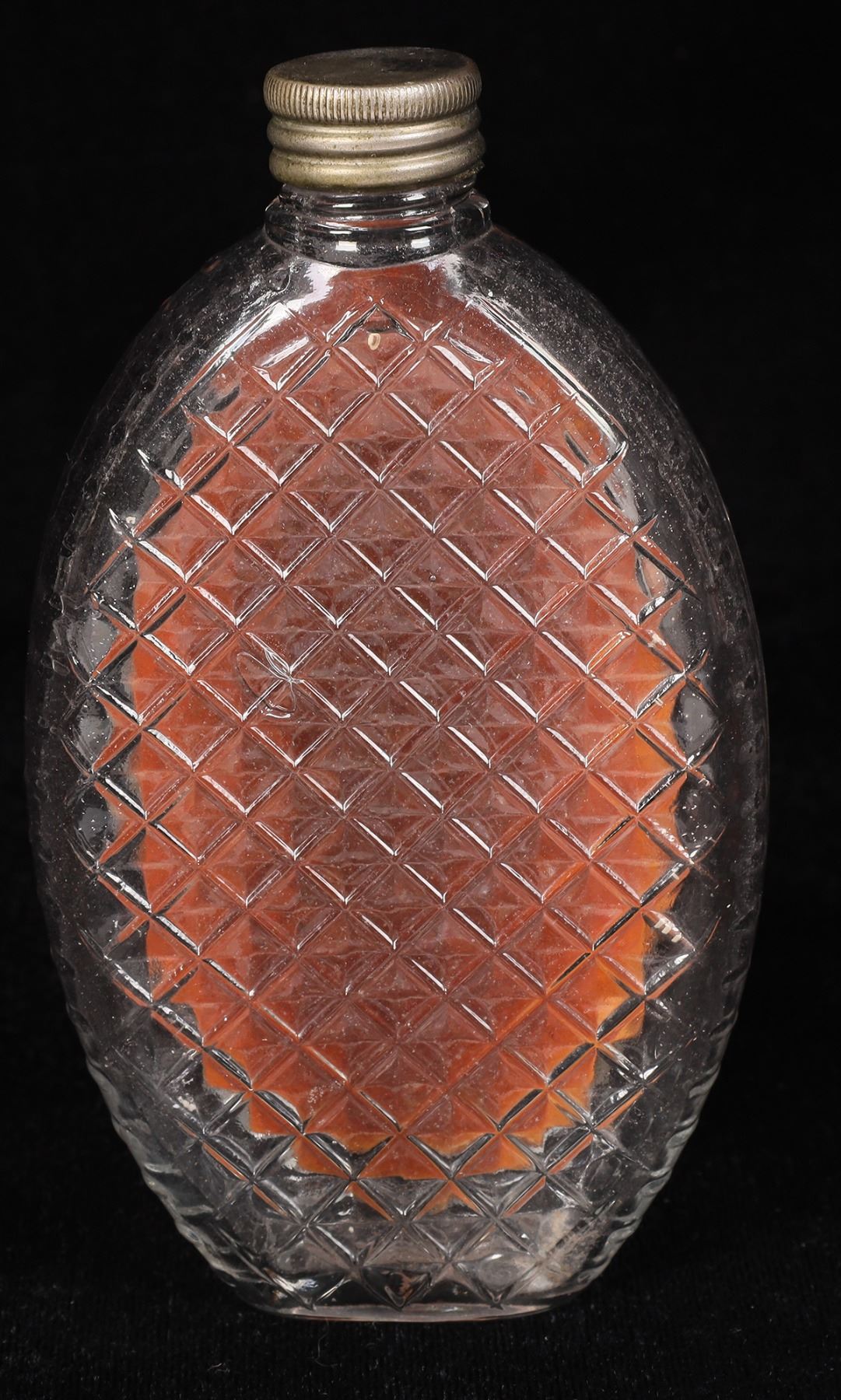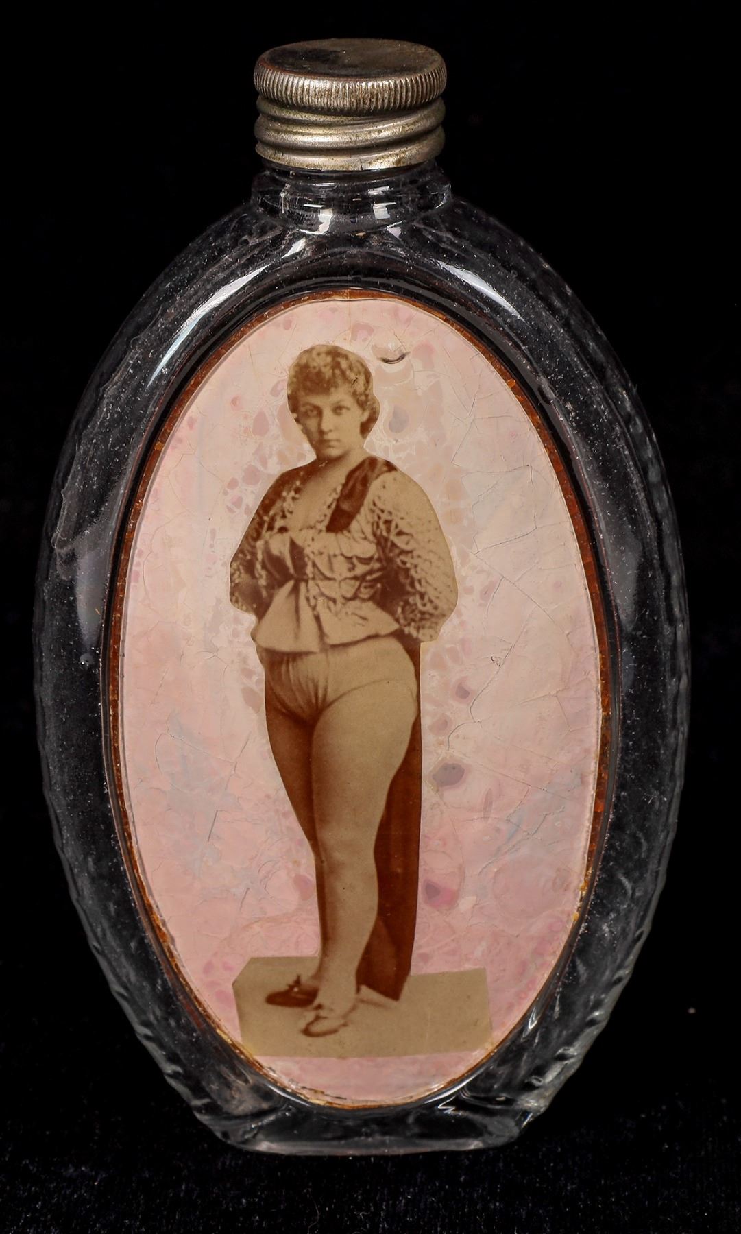 Unusual c. 1880-1910 clear glass "standing girl" pictorial label under glass flask. Patented in 1862 by William Nalton originally for pharmacies, this became a popular and attractive way to package hair tonics and spirits. 6" with ground top and original metal cap. Very fine and a standout bottle for your collection.