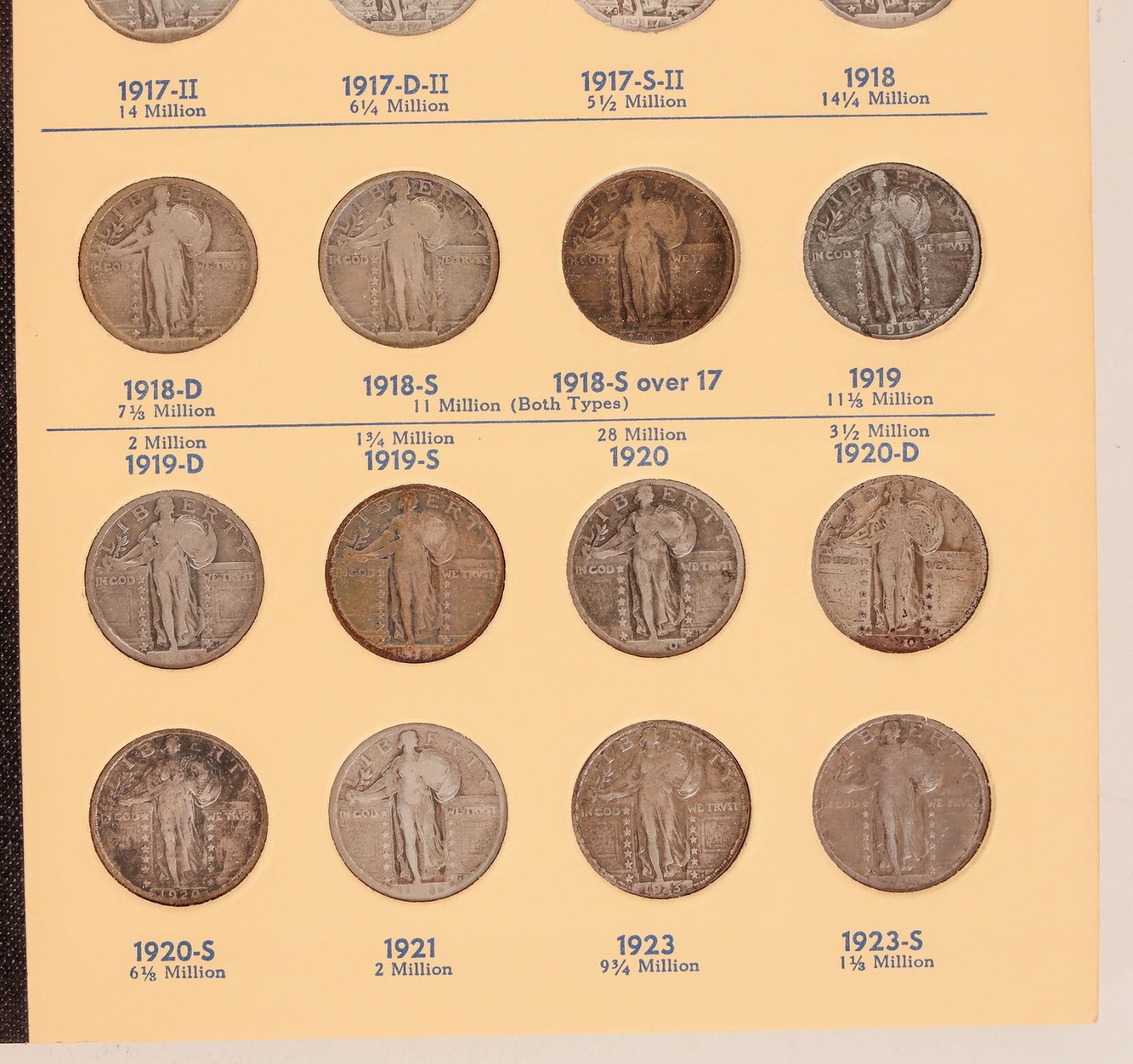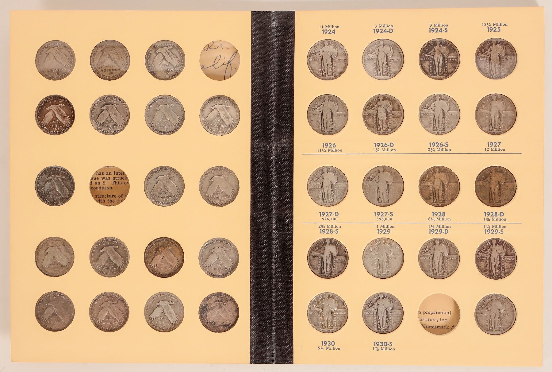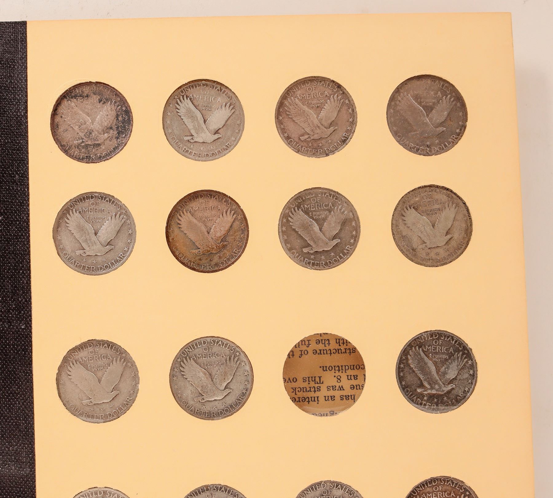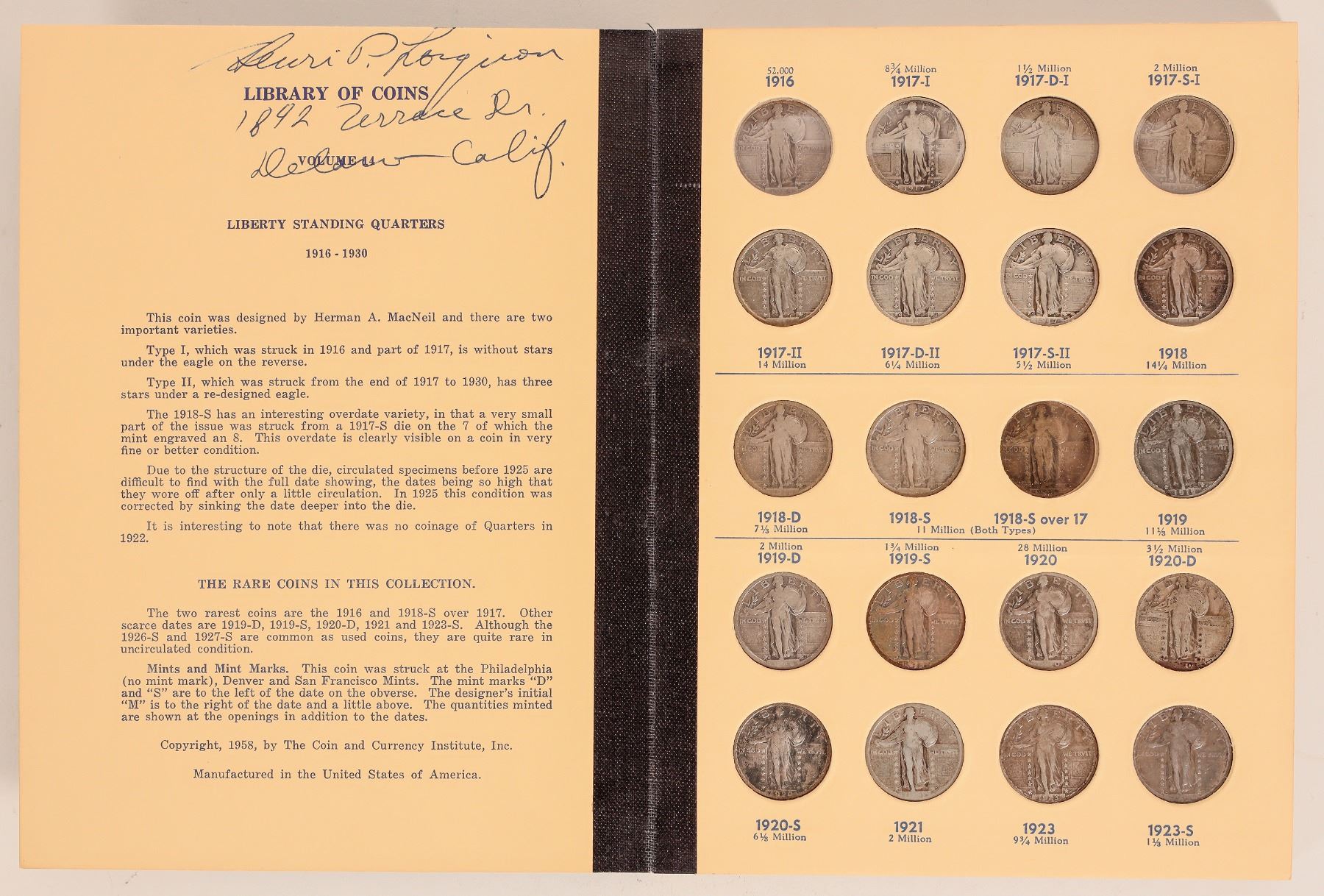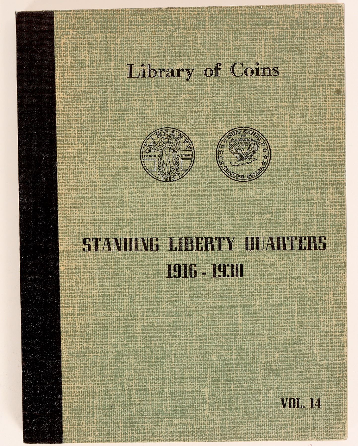 Library of Coins Vol. 14: Standing Liberty Quarters 1916-1930, copyright 1958 with 37 coins in place. Missing 1916 and 1918-S over 17. Most coins are AG-VG condition.