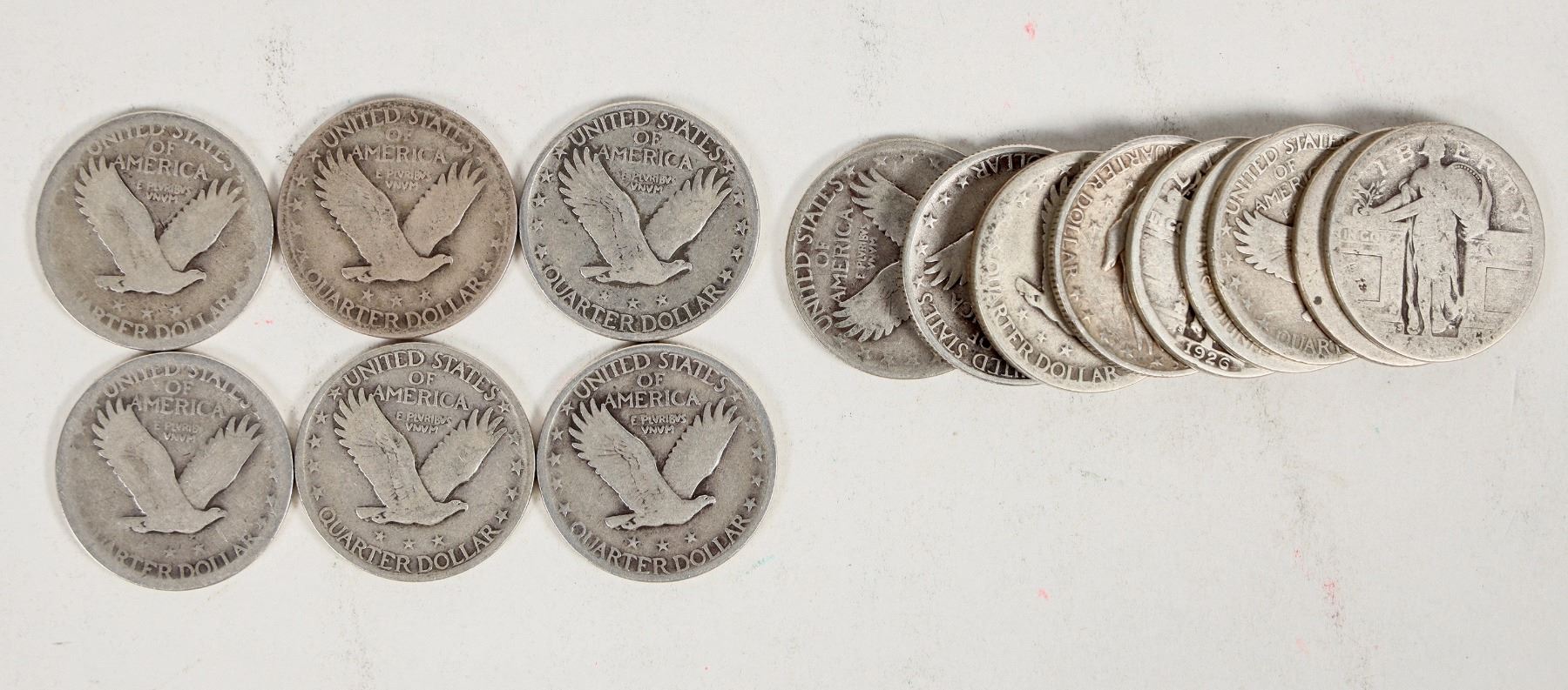 Sixteen Standing Liberty quarters. Four with no date; 1925; 1926-D; 1926-S (2); 1927; 1927-S; 1928-D; 1929-S; 1930-S. AG-VG condition.