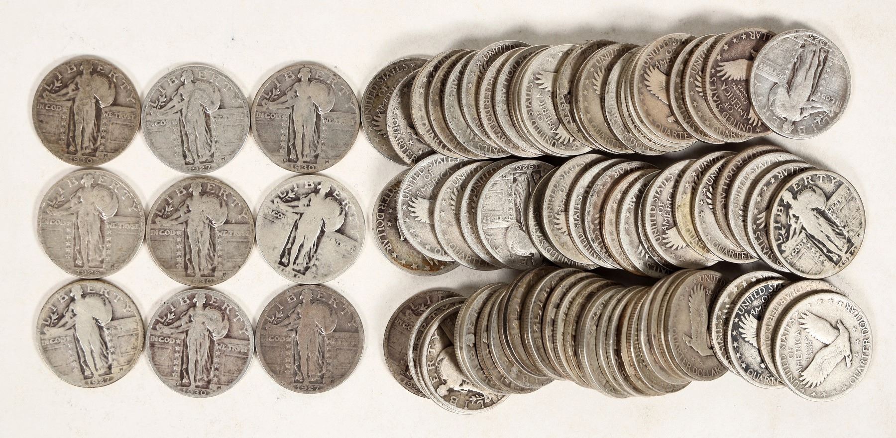 Two rolls of circulated Standing Liberty quarters. All dates readable, VG-VF condition. 80 coins total, mostly 1920s.