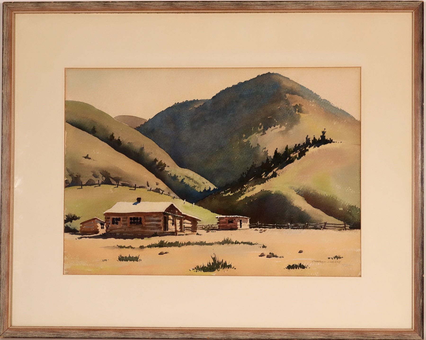 Log cabin and corral, mountains in the background.. Stanford Stevens (1897-1974) studied art in Paris. In the 1930's he moved to Tucson, Arizona, and in 1962, moved to Mexico. Painting, 14" x 20.5", matted and framed, 23" x 29". Vermont