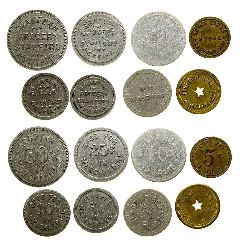 Eight tokens. Four from Stanford Grocery, 2 from M A Grosskoph, one each from Hotel Cigar Store and Club Pool Hall. (Svoboda Collection) City: Stanford State: Montana Date: HWAC# 36002