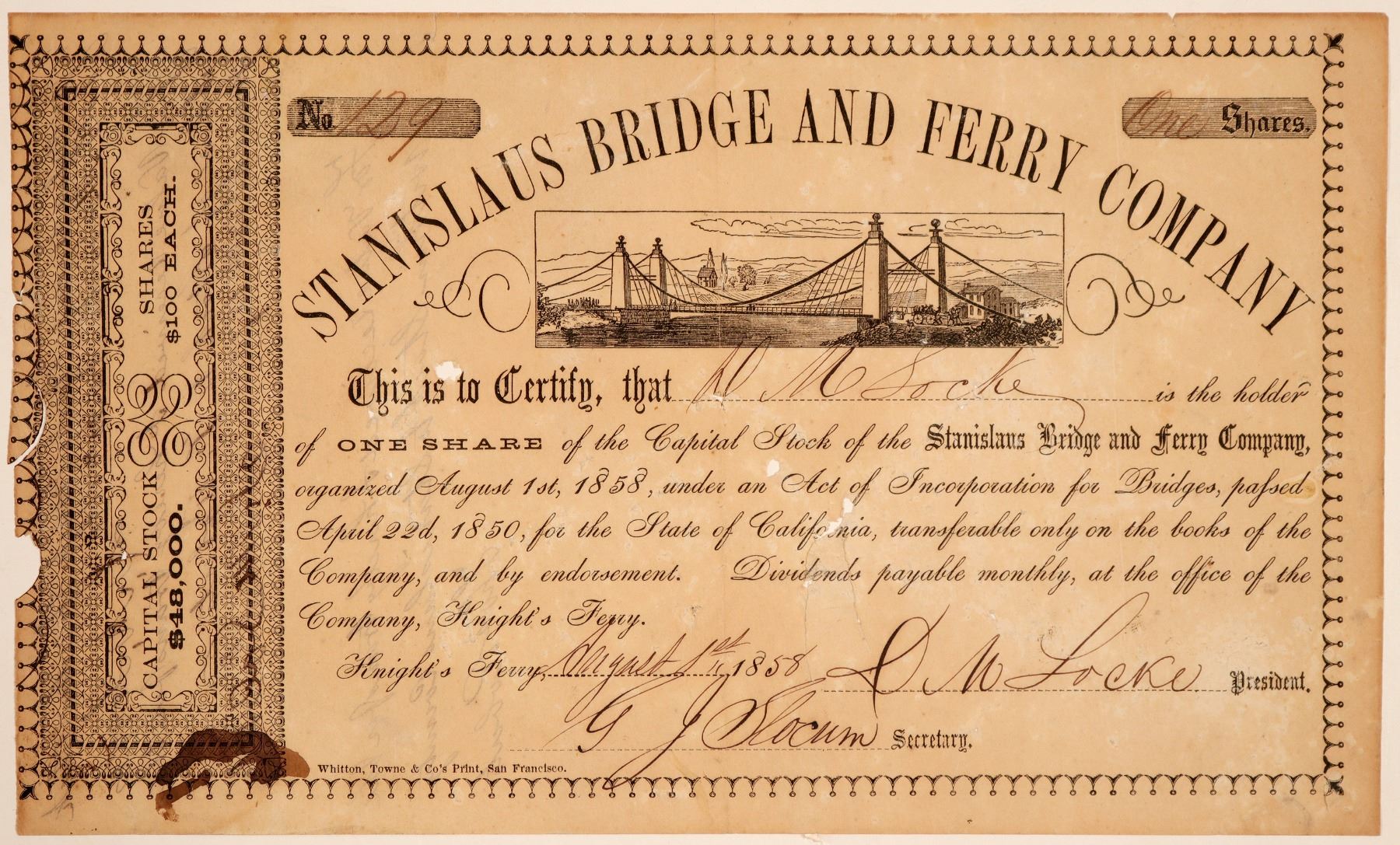Possibly unique Gold Rush stock. No. 129, issued for one share to president D.M. Locke on Aug. 1st, 1858 in Knight's Ferry. Signed by president David Locke and secretary G. Slocum. Not cancelled. Black border and print on thin paper. Very nice bridge vignette. Printed by Whitton, Towne & Co., SF.6 x 10" Heavily toned, fragile with some small areas missing. The Sacramento Daily Union, Aug. 13th, 1859, reports that the company has built a wire suspension bridge over the Stanislaus River. David Locke bought the Knight's Ferry business from the Dent Brothers in 1856. He also built a flour mill there. The bridge was finished in 1857, but destroyed by a flood in 1862. Ken Prag Collection