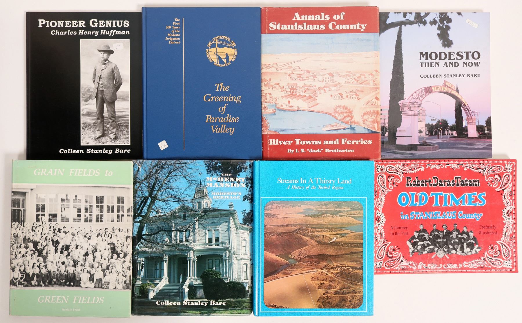 Lot of 8. 1) Streams in a Thirsty Land, Hohenthal, 1972, hardcover(hc), no DJ. 2) The McHenry Mansion, Bare, 1985, hc with DJ. 3) Grain Fields to Green Fields, Beard, 1987, signed, hc with DJ. 4) Modesto Then and Now, Bare, 1999, sc. 5) Annals of Stanislaus County, Brotherton, 1982, hc with DJ. 6) The Greening of Paradise Valley, Barnes, 1987, hc with no DJ. 7) Old Times in Stanislaus County, Tatam, 1994, sc. 8) Pioneer Genius Charles Henry Huffman, Bare, 2003, signed, sc.