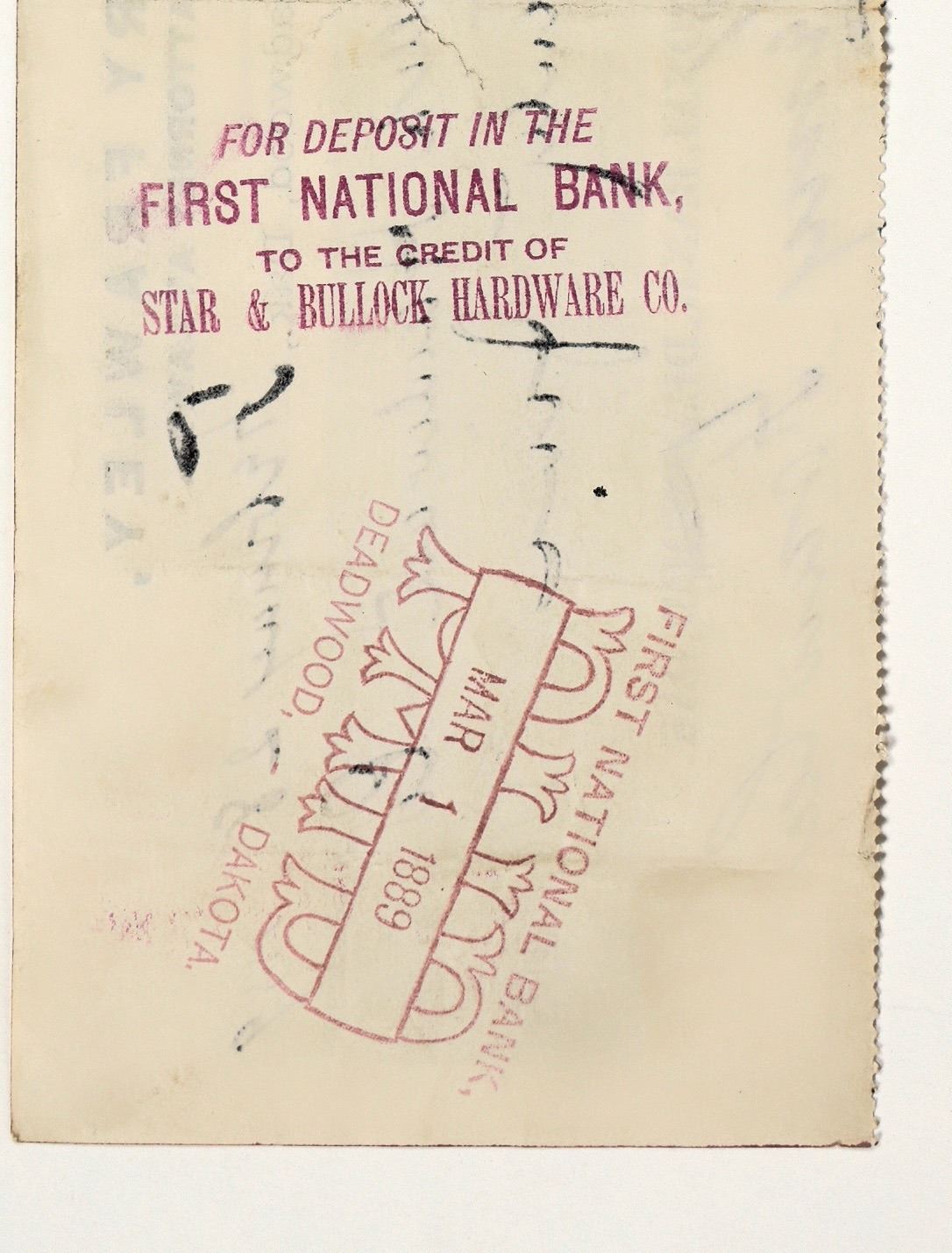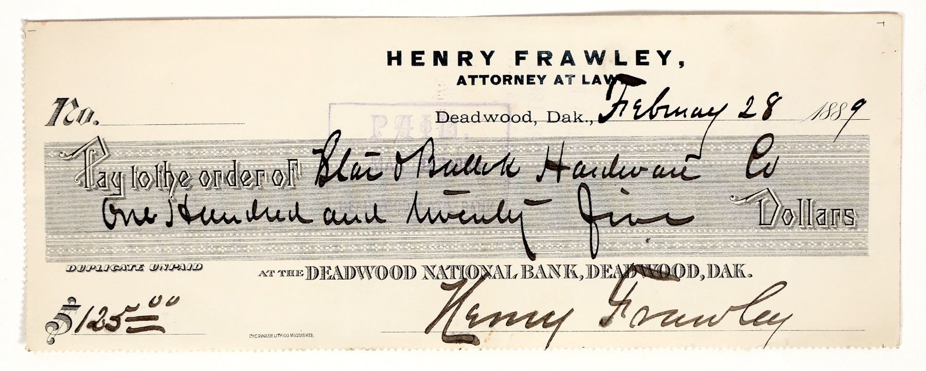 Out of the 1,700 plus checks we sorted through in the Henry Frawley Deadwood archive, this was only one of two found that was tied to legendary sheriff Seth Bullock! Issued 1889 for $125. Stamped on the back with the store's stamp. Not signed by Bullock or Star. This partnership was comprised of Seth Bullock and Sol Star, who came to Deadwood in 1876 the day before Wild Bill Hickok was murdered. Bullock was drafted to become Deadwood's first sheriff. He later become a US Marshal and was good friends with Teddy Roosevelt. In addition to being a successful businessman, Sol Star also served as Deadwood's mayor. The two were main characters on the critically acclaimed HBO series "Deadwood."