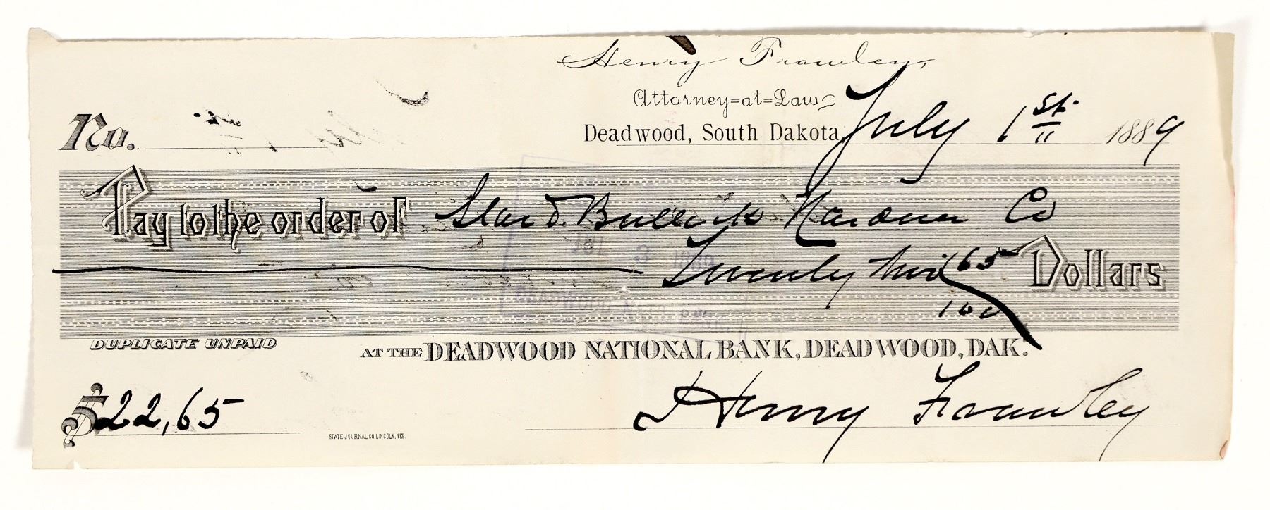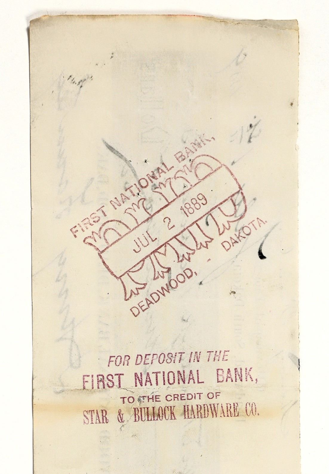 Out of the 1,700 plus checks we sorted through in the Henry Frawley Deadwood archive, this was only one of two found that was tied to legendary sheriff Seth Bullock! Issued 1889 for $22.65. Stamped on the back with the store's stamp. Not signed by Bullock or Star. This partnership was comprised of Seth Bullock and Sol Star, who came to Deadwood in 1876 the day before Wild Bill Hickok was murdered. Bullock was drafted to become Deadwood's first sheriff. He later become a US Marshal and was good friends with Teddy Roosevelt. In addition to being a successful businessman, Sol Star also served as Deadwood's mayor. The two were main characters on the critically acclaimed HBO series "Deadwood."