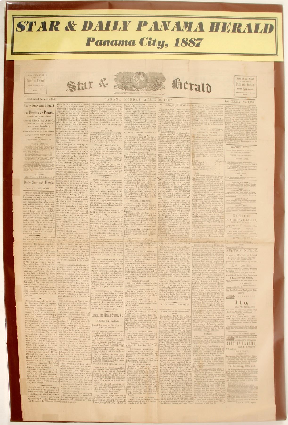 April 25, 1887 front page of newspaper. Includes some passengers arriving from San Francisco by ship and a death bed confession to a murder. On Mat Board (not adhered) with plastic covers. If mats are shipped then additional shipping may apply.