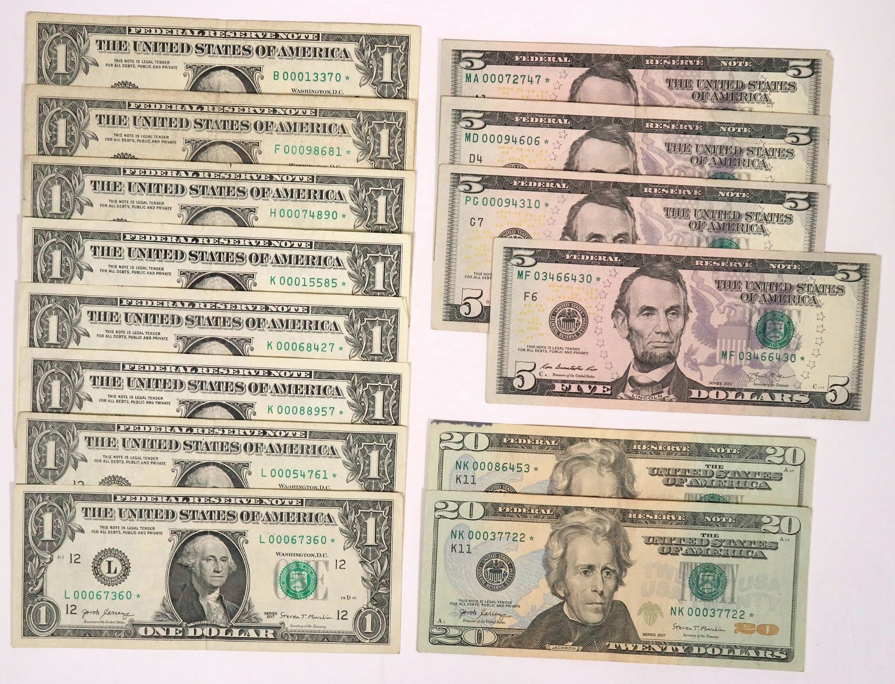 $68 face value of U. S. currency. Star notes with low serial numbers: eight $1; three $5; two $20; one bookends full radar $5 note.