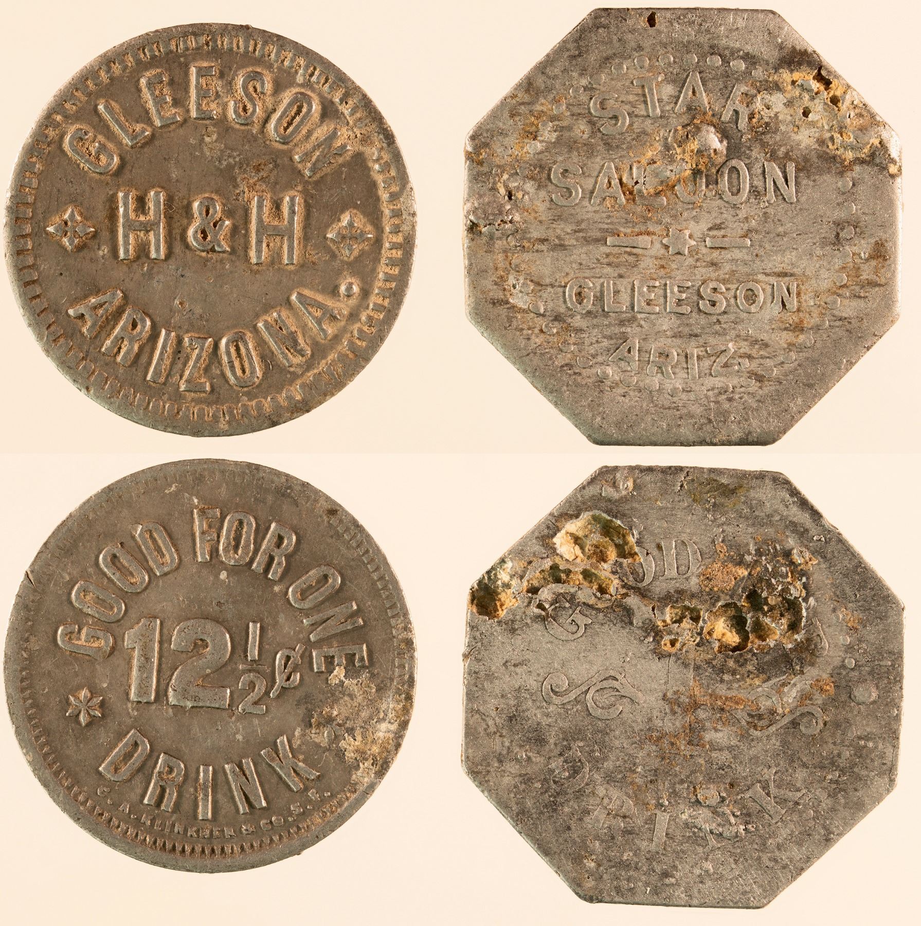 Two tokens from Gleeson: 1) GLEESON / H & H / ARIZONA. // GOOD FOR ONE / 12½¢ / DRINK / C.A. KLINKNER & CO. S.F.; Al., rd., 25 mm. R 9. 2) STAR / SALOON / GLEESON / ARIZ. // GOOD FOR / 1 / DRINK; Al., oct. 28 mm. R 9.