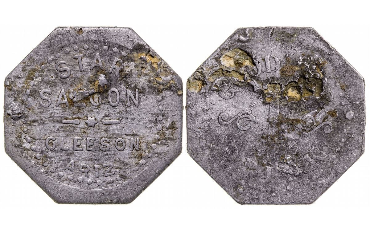 Obv.: Star / Saloon / Gleeson / Ariz.; Rev.: Good for / 1 / Drink; Al.,octogonal, 28mm, R9. As is, environmental damage.