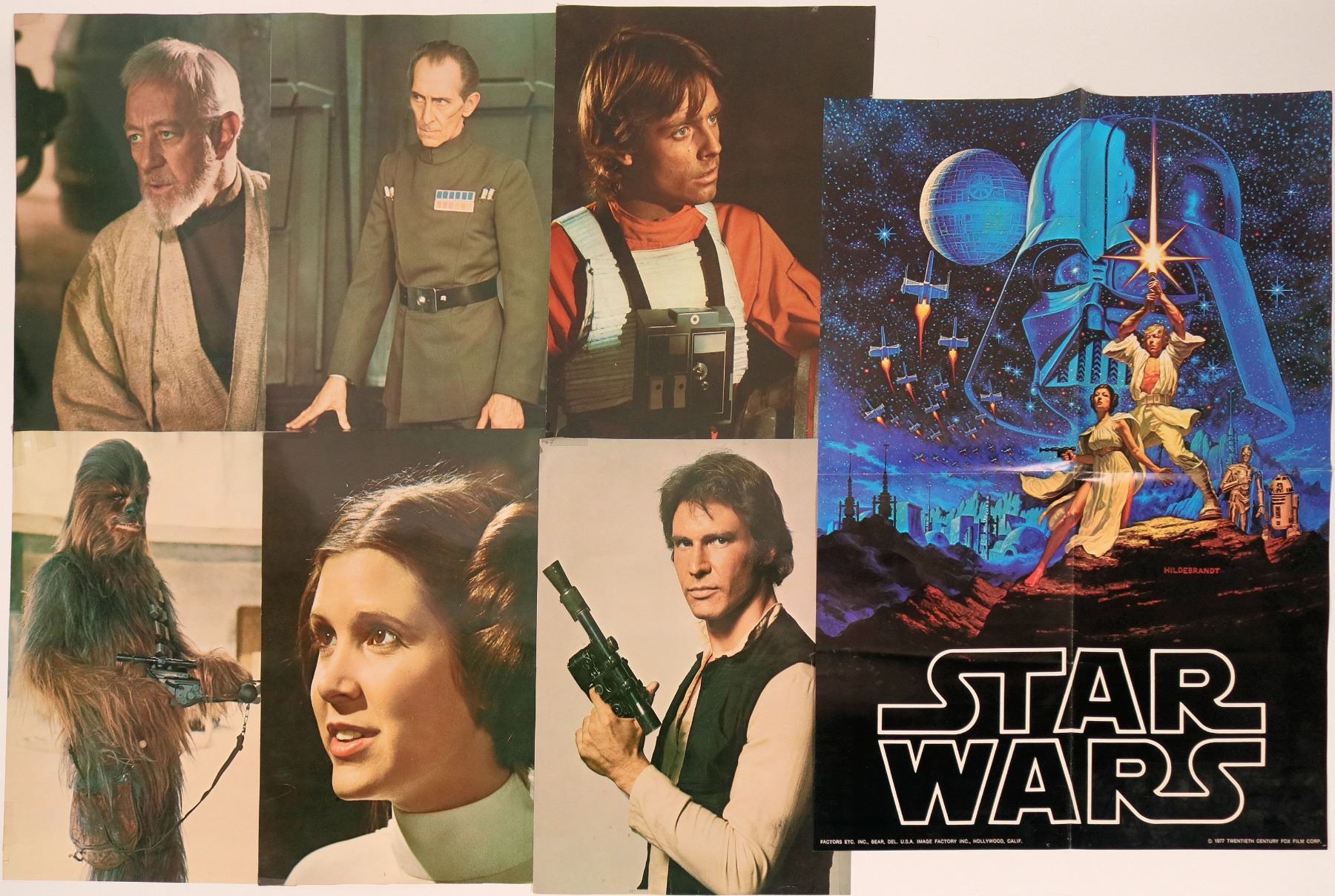From the Original Star Wars Trilogy! 6 Large 12" X 17" Glossy Photo Reproductions of Cast in original movie scenes, on heavy photo paper: Chewbaca, Hans Solo, Luke Skywalker, Princess Leia, Obi-Wan Kenobe, and Grand Moff Tarkin. Pictures have been scotch taped to wall and put on display, which is apparent by condition, although no major flaws exist. There is some tape residue and wear to the edges. Also included in Lot is iconic poster that was part of a series of posters printed by Factors Etc. Inc., Bear, Del. U.S.A. and Image Factory Inc., Hollywood, Calif. It was a tie-in with the blockbuster film's theatrical release in the summer of 1977. It contains the famous Hildebrandt brothers artwork. The illustration was ultimately used on many of the international theatrical posters as well as initial ad campaigns in the USA. Below the art is the Star Wars logo outlined in white and the 1977 Twentieth Century Fox Film Corp. copyright is found in the bottom right hand corner. 28" X 20" Poster has been folded in half twice and is creased. Single pin holes on each corner. Otherwise good condition.