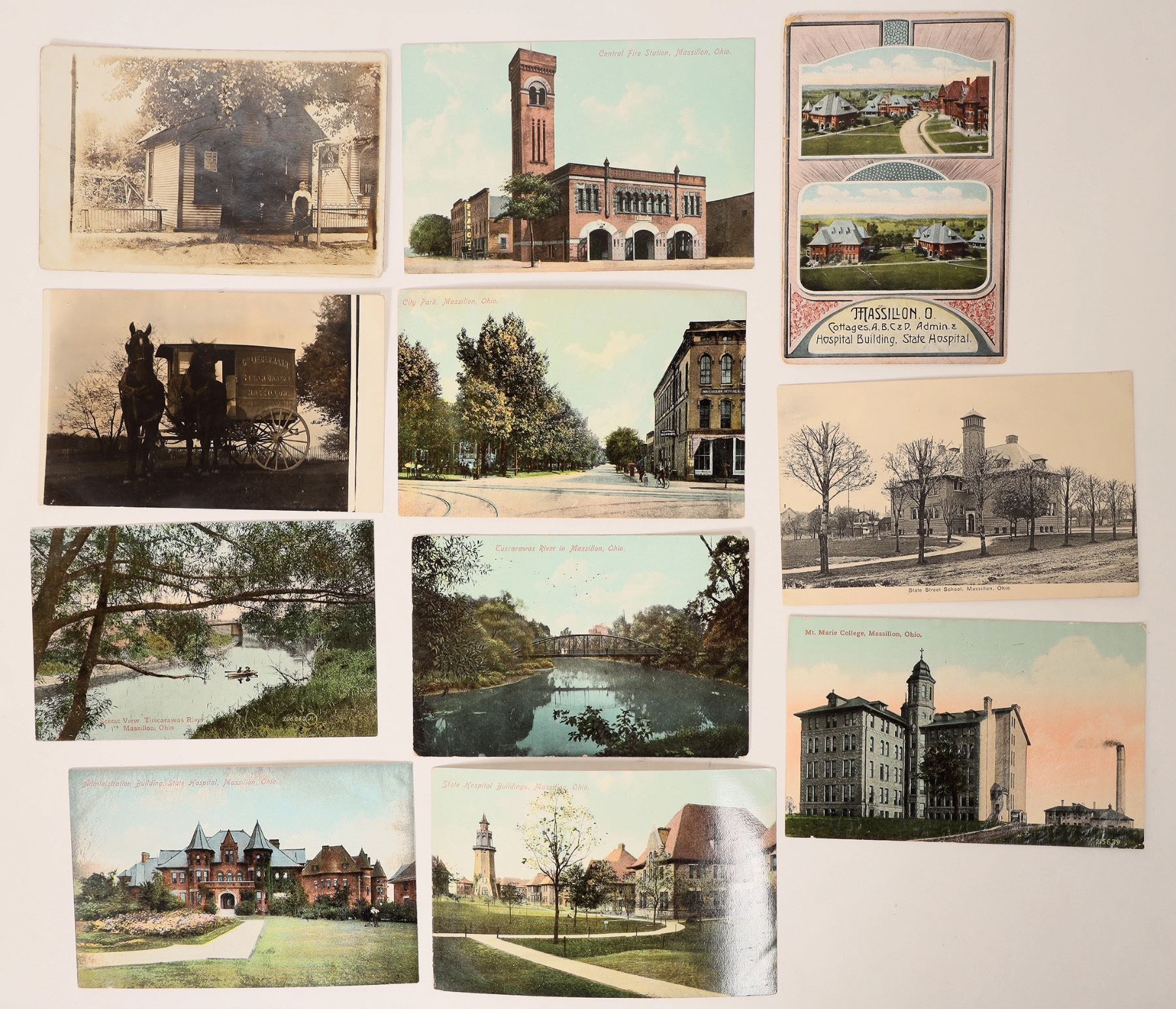 Collection of 11 postcards from Massillon, Ohio, Stark County, c1910-11. Includes 2 RPCs: XRARE Massillon bakery delivery wagon; and Shoe Shop/Melvin Willard exterior. Others include State Street School, Central Fire Station, Mt. Marie College, State Hospital, etc.[ Massillon Ohio