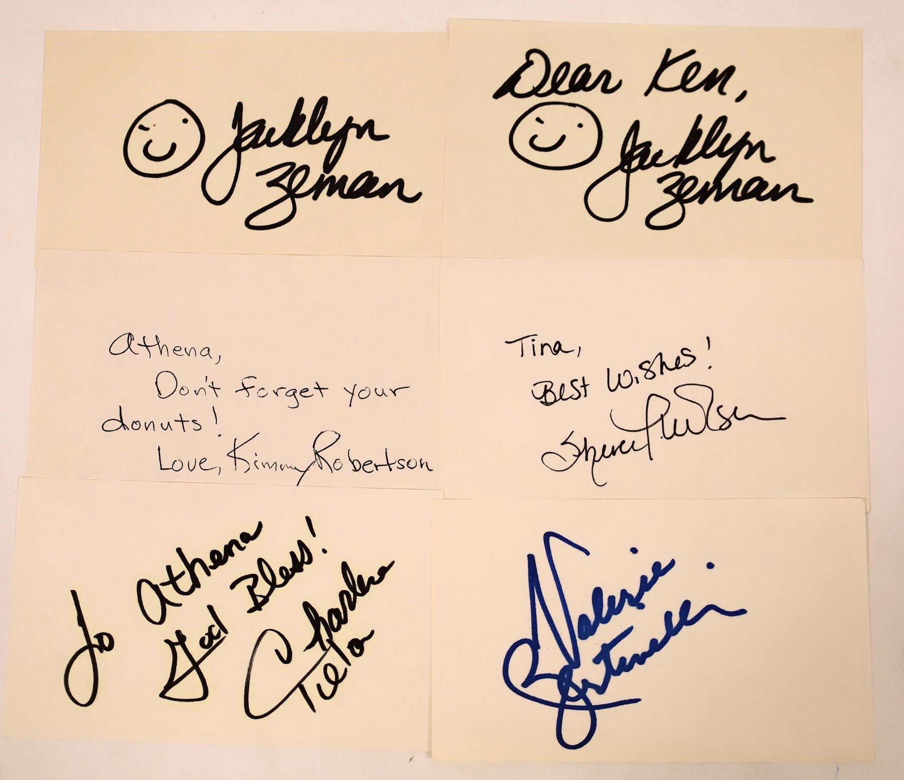 This lot includes: Kimmy Robertson a voice actress ("Beauty and the Beast," "Ollie & Scoops"); Charlene Tilton and Sheree Wilson, ("Dallas"); Talia Balsam ("Mad Men"); Valerie Bertinelli ("One Day at a Time") and Jacklyn Zeman ("General Hospital"). All signatures clear. Please see photos for more detail and condition.