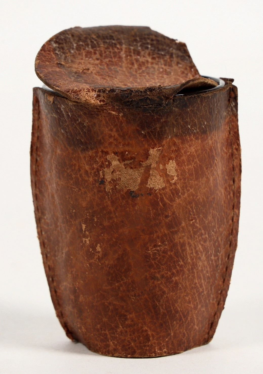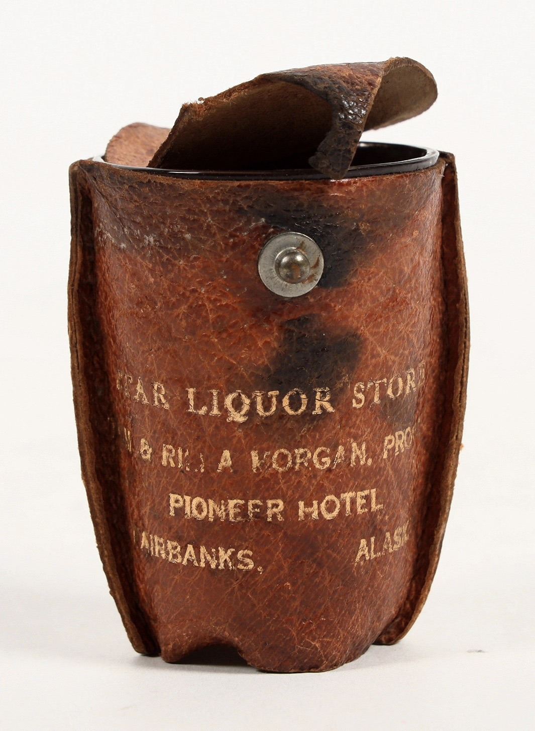 Clear shot glass, unetched, in a gilt lettered leather case for the Starr liquor Store in the Pioneer Hotel, Fairbanks. Very unusual. circa 1910.
