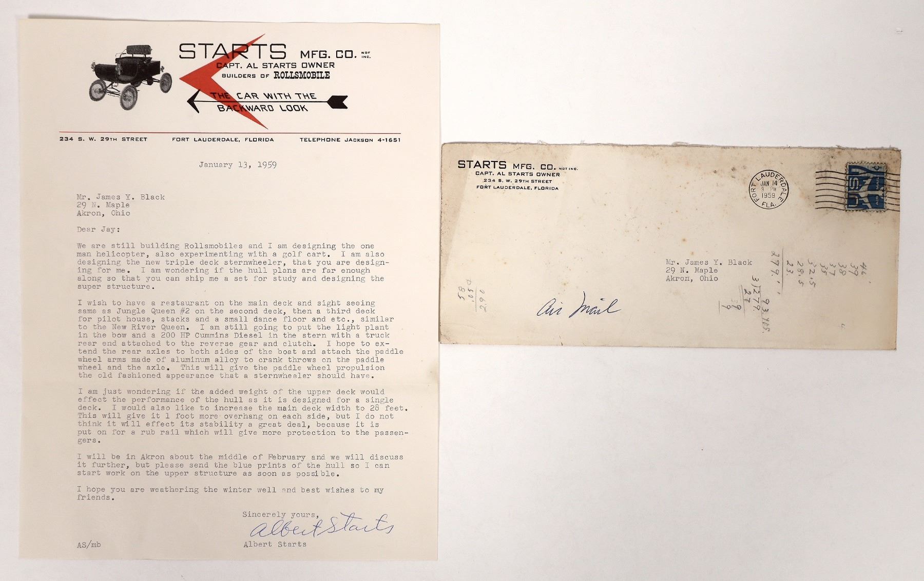 1959 pictorial letterhead, Starts. Mfg. Co with Rollsmobile photo. The letter is to James Black with details of the planned design of a triple deck sternwheeler in addition to existing Rollsmobiles, "The car with the backward look". Starts is also designing a one man helicopter and experimenting with a golf cart. Signed by Albert Starts. What a busy man! We could not find any online info on this company.