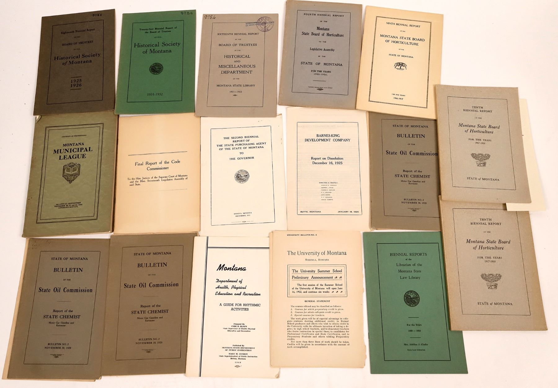 This lot contains about fifteen booklets on Montana legal protocol from teaching to the composition of gasoline. Montana State Board of Horticulture 1915-1916, 1916-1917, 1917-1918 (2 copies); Board of Trustees of the Historical Misc. Department 1921-1922, 1931-1932, 1925-1926; Librarian of the Montana State Law Library 1938-1954, The University Summer School Preliminary Announcement; Montana Department of Health, Physical Education and Recreation 1949; State Oil Commission State Chemist on Motor Car Gasoline and Kerosene 1920 (3 copies); The State Purchasing Agent of the State of Montana to the Governor 1932; State Board of Charities and Reform 1910; Montana Municipal League 1916. From the Stewart MacKenzie collection. From the Stuart MacKenzie collection. Montana Stuart Mackenzie Montana Ephemera Collection