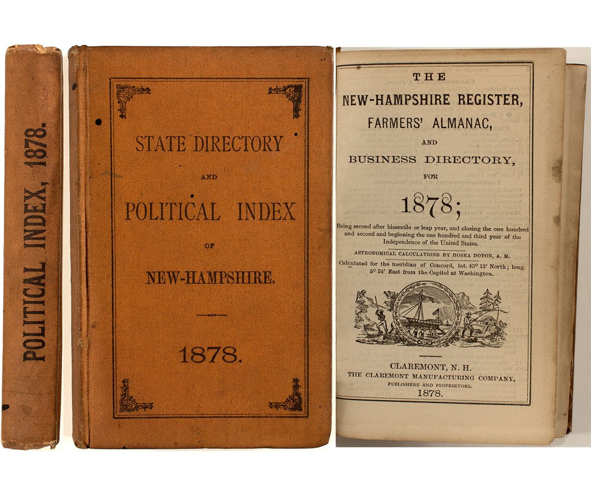 Includes the New Hampshire Register, Framers’ Almanac, and Business directory, The Claremont Manufacturing Company, publishers and proprietors. Also state societies, railroads, populations, etc. Hard covered in 245 pages with 40 page appendix. Two maps, one colored. Both are in excellent condition. One has a tear at the intersection of two folds. [Rarity: ii]City: County: State: NHDate: 1878