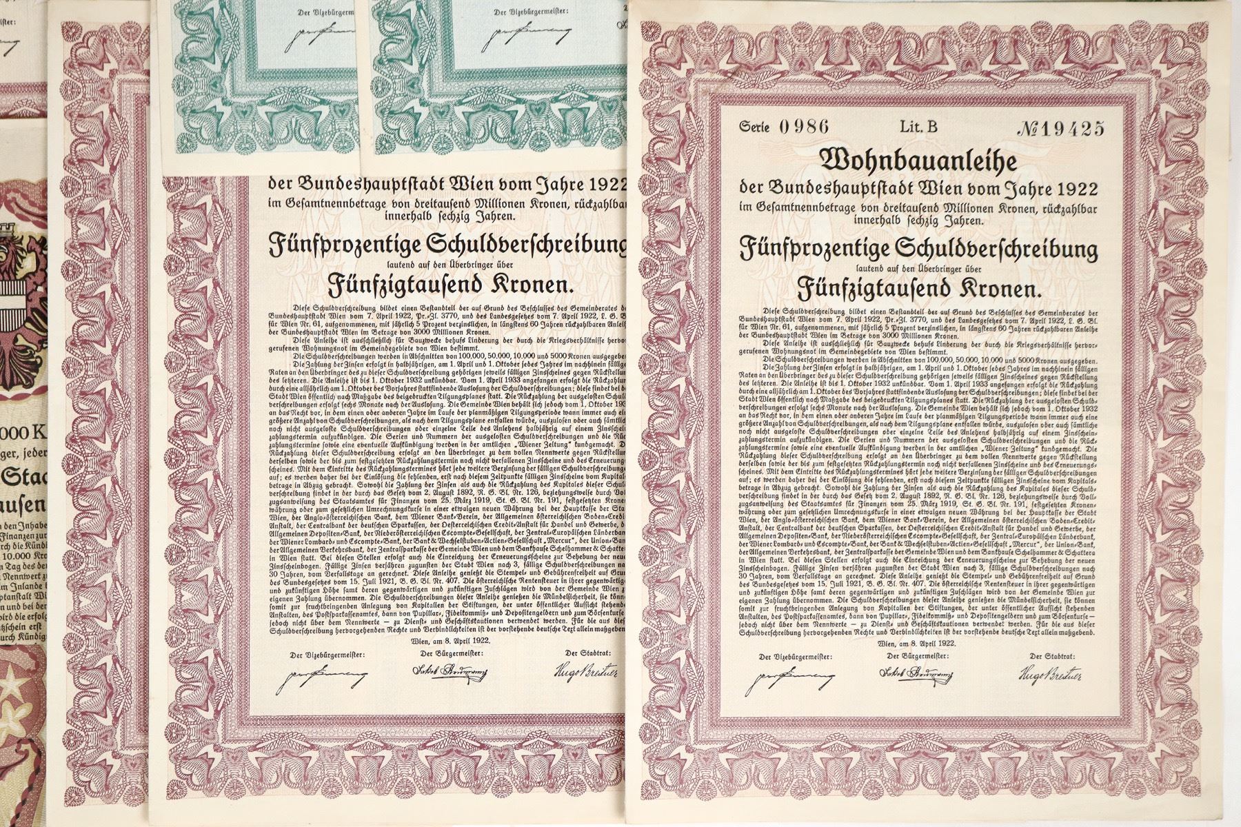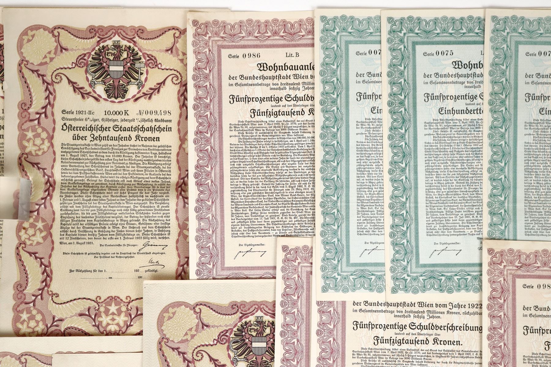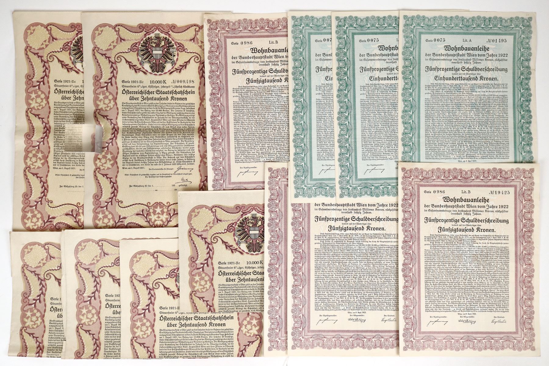Lot of 12. Denominations from 10,000-100,00 crowns. Austria State issued bearer bonds. The 10,000 bonds are the only ones w/vignette of the current coat of arms : single headed eagle holding hammer and sickle. All have coupons attached. Cond. EF.