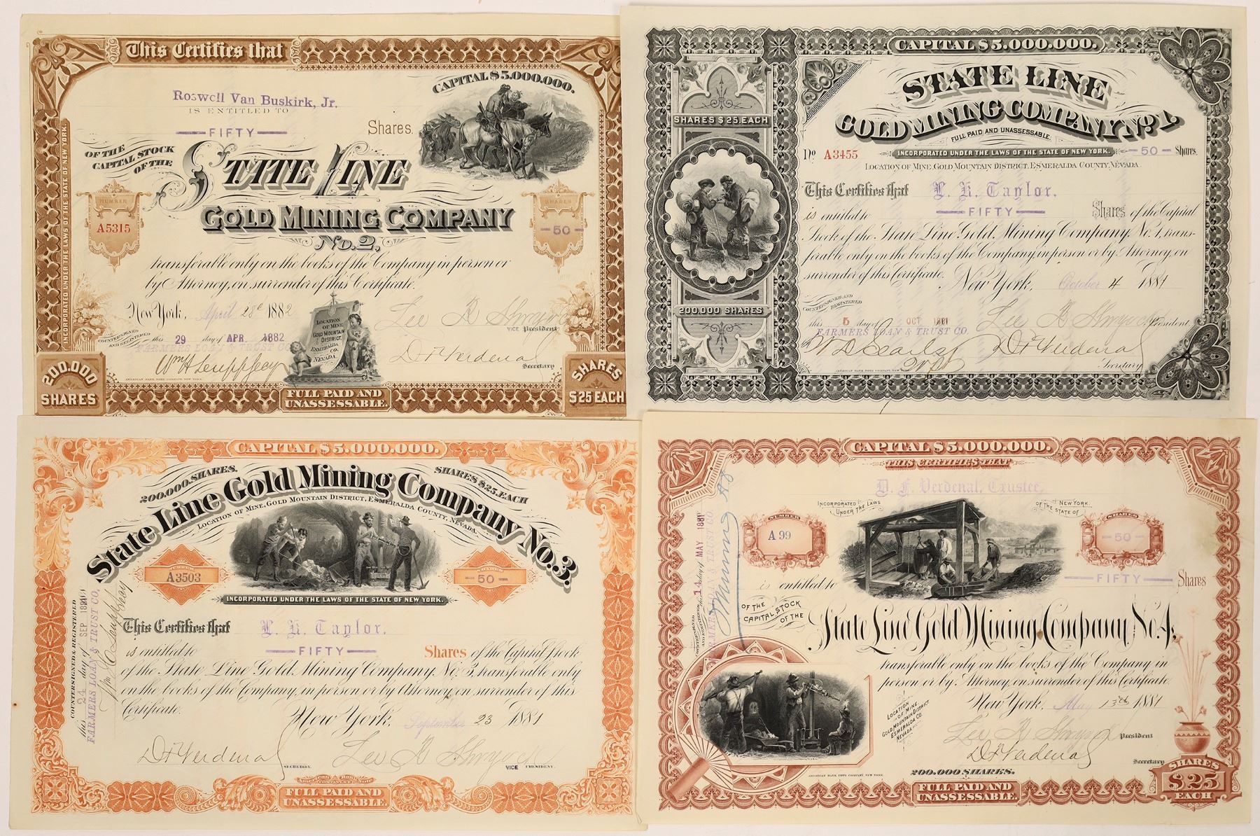 Four (4) certificates issued by State Line Gold Mining Company for Mines #1-#4. Issued to L.R. Taylor for 50 shares of #1 at $25 per, dated October 4, 1881, with miners vignette and 50 shares on #3 at $25 per, dated September 3, 1881 with miners' discovery vignette. Issued to D.F. Verdenal, 50 shares at $25 per on Mine #4, dated May 13, 1881, with two miner vignettes and issued to Roswell Van Buskirk, 50 shares at $25 per on Mine #2, dated April 29, 1882, with explorers on horseback vignette. All are signed by D.F. Verdenal, secretary and Lee R. Shryock, vice president. Please see photos for more detail and condition. State:Nevada City:Esmeralda County Date:1881 Provenance: