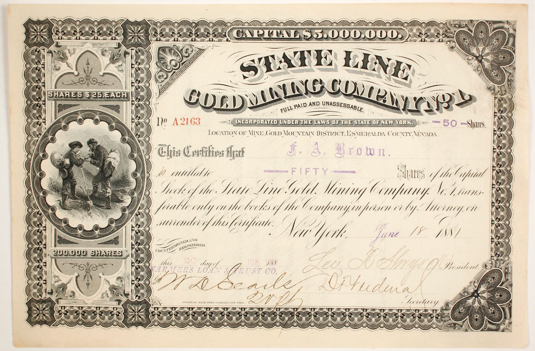 50 shares of State Line Gold Mining Company No. 1, #A2163 issued to F. A. Brown on June 18, 1881, countersigned and registered June 20, 1888. Signed by president, Lee. R. Shryock and secretary, D. F. Yerdenal. Located Gold Mountain District, Esmeralda Co. NV. Assigned on June 21, 1887 signed by F.A. Brown and H M Cooke. Vignette 2 minors. Printed: American Bank Note Co, NY. Ken Prag Collection
