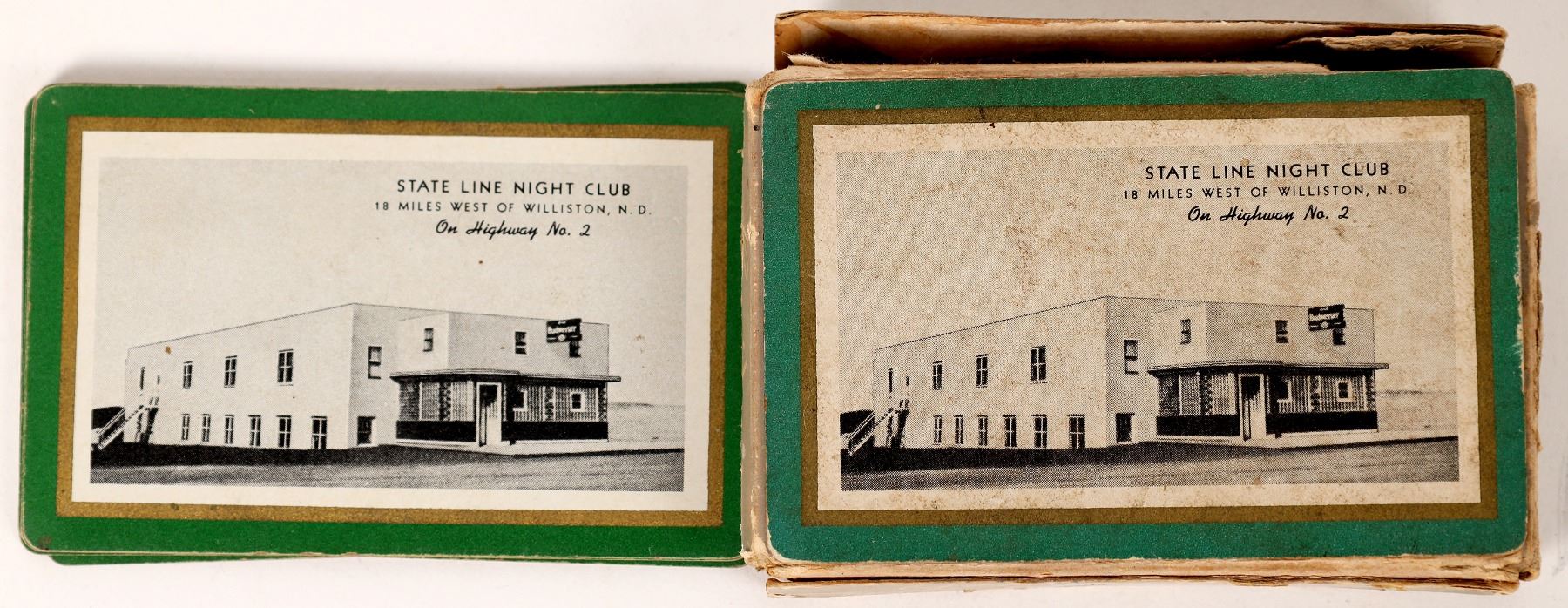 Deck of advertising playing card from State Line Night Club, Williston, ND. In cardboard holder with split seam, 2.5x3.5". North Dakota