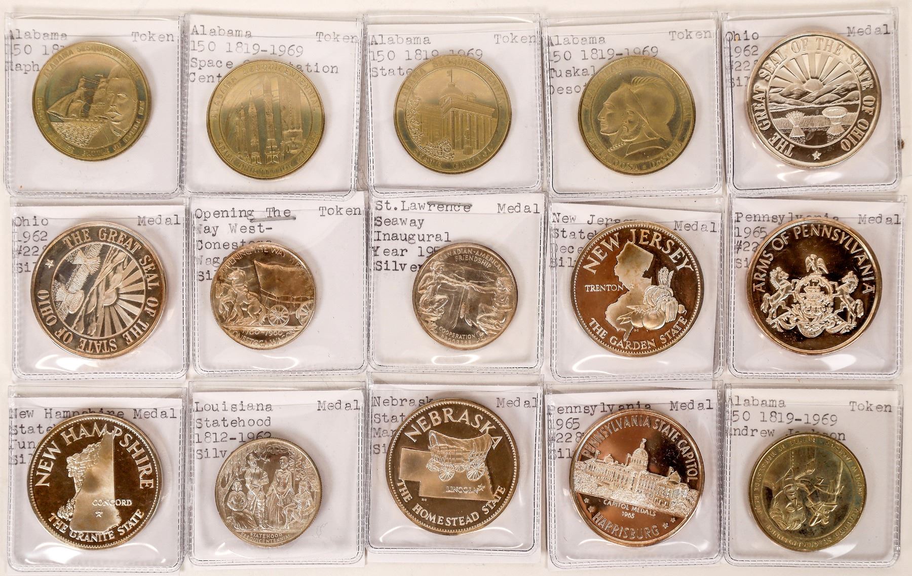 Lot of 15 silver medals commemorating states. Seven are 38 mm, .925 silver, 33.0 gr. (.980 oz. ASW): Nebraska, New Hampshire, New Jersey, Pennsylvania (2), Ohio (2). Five different Alabama medals are 33 mm, 12.2 grams. Three 30 mm medals commemorative: Louisiana Statehood, St. Lawrence Seaway 1959, Opening the Way West- Conestoga Wagons.