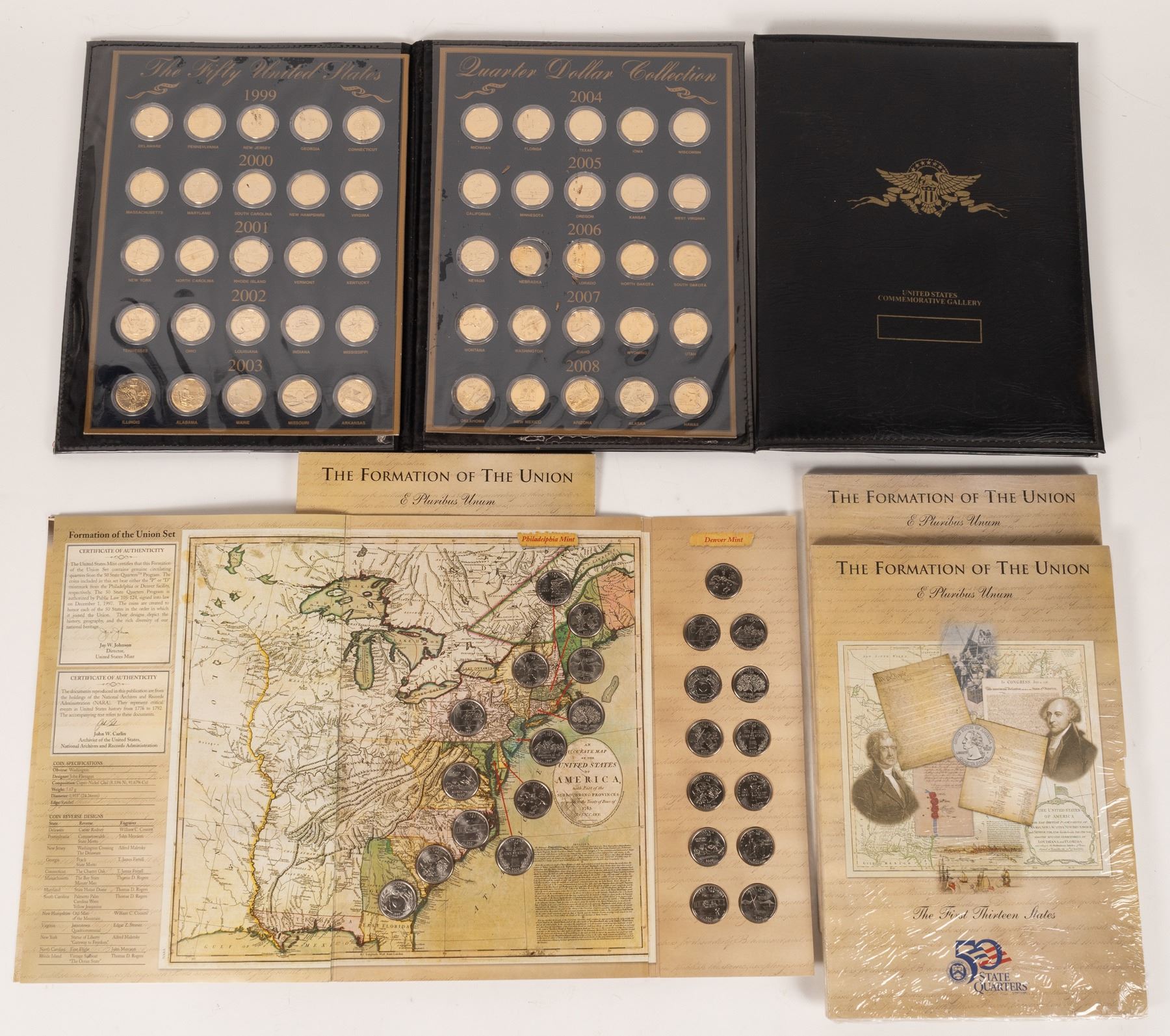 Two complete sets of gold plated state commemorative quarters by the United States Commemorative Gallery 1999-2008. Three sets from the United States Mint entitled "The Formation of The Union," containing a history of and map and state quarters from the first thirteen states.