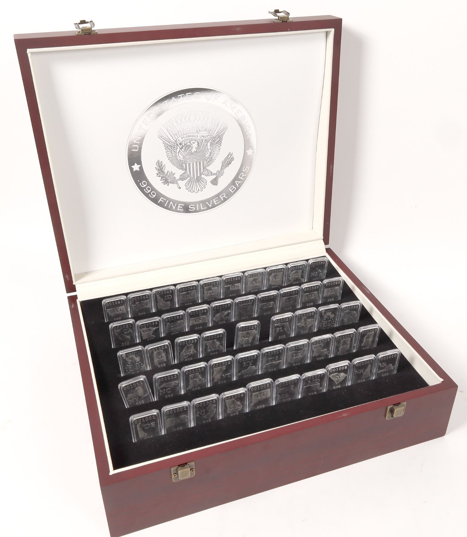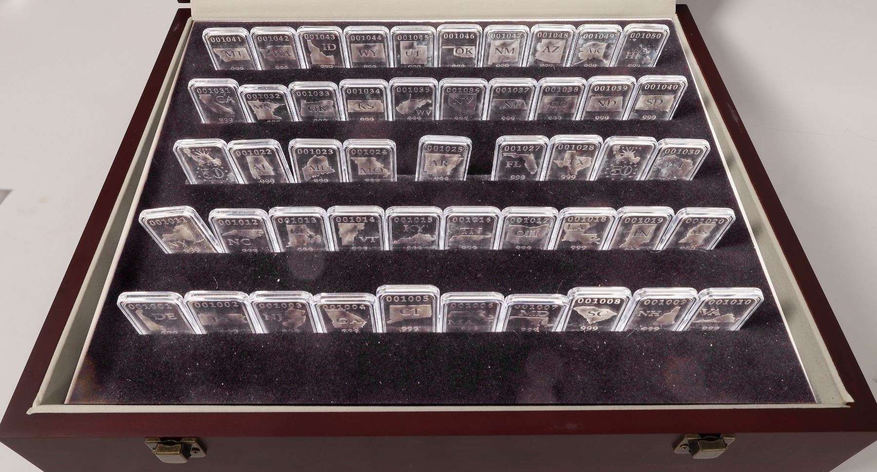 Issued by the Federated Mint: wooden case (14 x 17 x 5 inches) with 49 of the fifty states (001026: Michigan is missing). We believe these to be 1/2 ounce .999 silver ingots. In their plastic case they weigh 22.3 grams each. If you find the Michigan ingot on the internet, you'll have the whole country.
