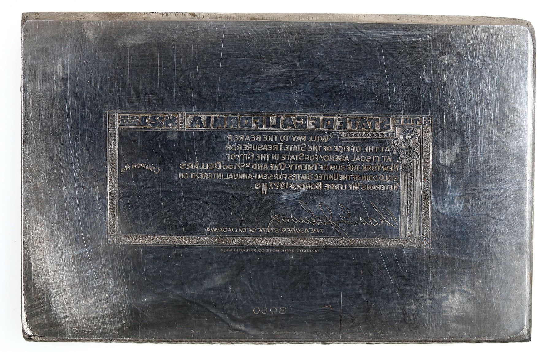 Steel printers plate for a bond coupon for a State of California Veterans' Welfare Bond of 1927. Redeemable for $21.25 in gold coin at the office of state treasurer. Signed by the Treasurer of the State of California. Security Banknote Company, Philadelphia. Lower on plate is number 3060. Plate is 2.75 x 4"