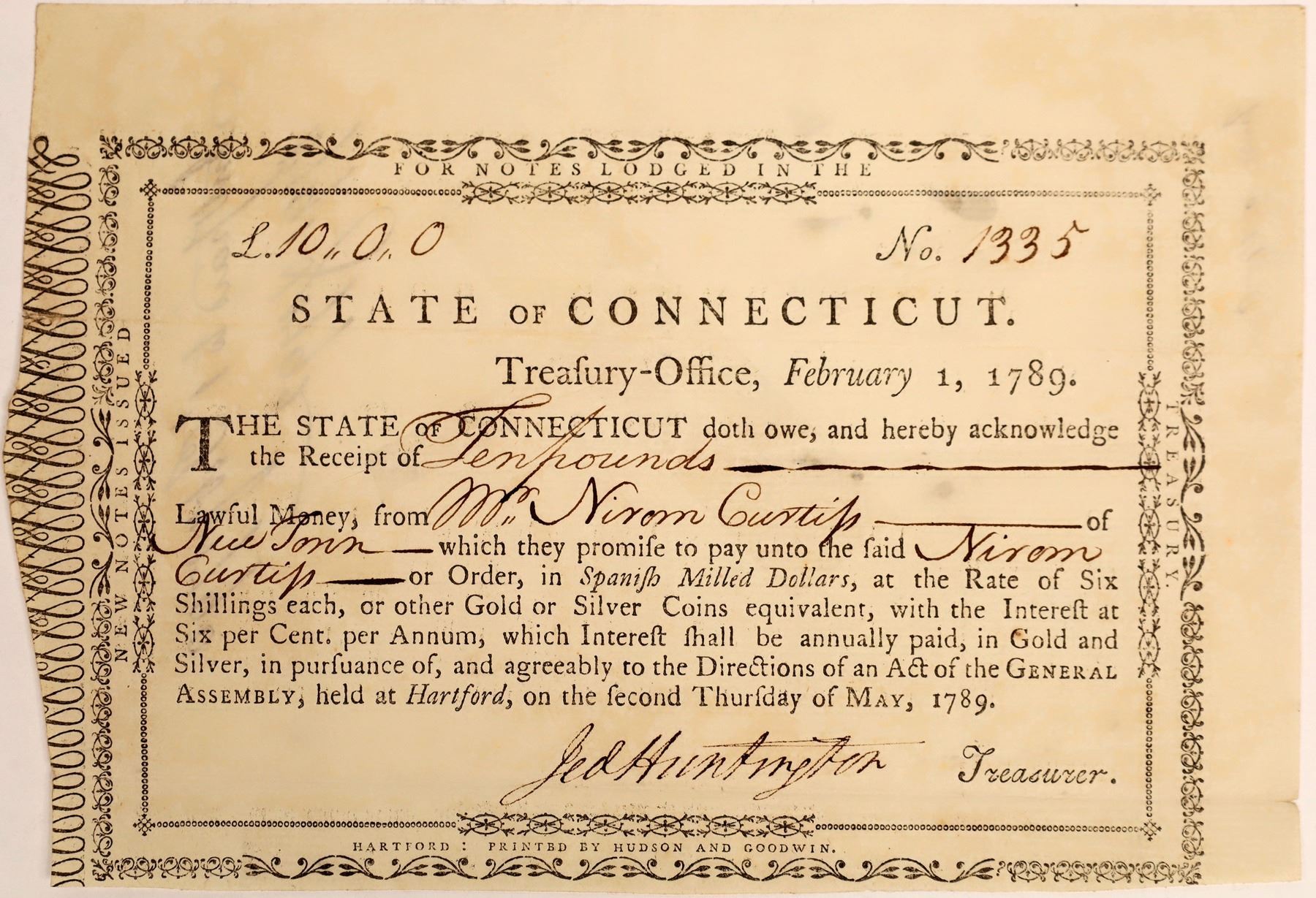 Early document #1335 dated February 1, 1789 for receipt of Ten Pounds for a Note Issued by the Treasury Office of the state. Signed by Jed Huntington, State Treasurer. Issued to Nirom Curtip. Hartford: Printed by Hudson & Goodwin. ''X" cut cancel thru the center is repaired with archival tape on the verso. Good condition overall.