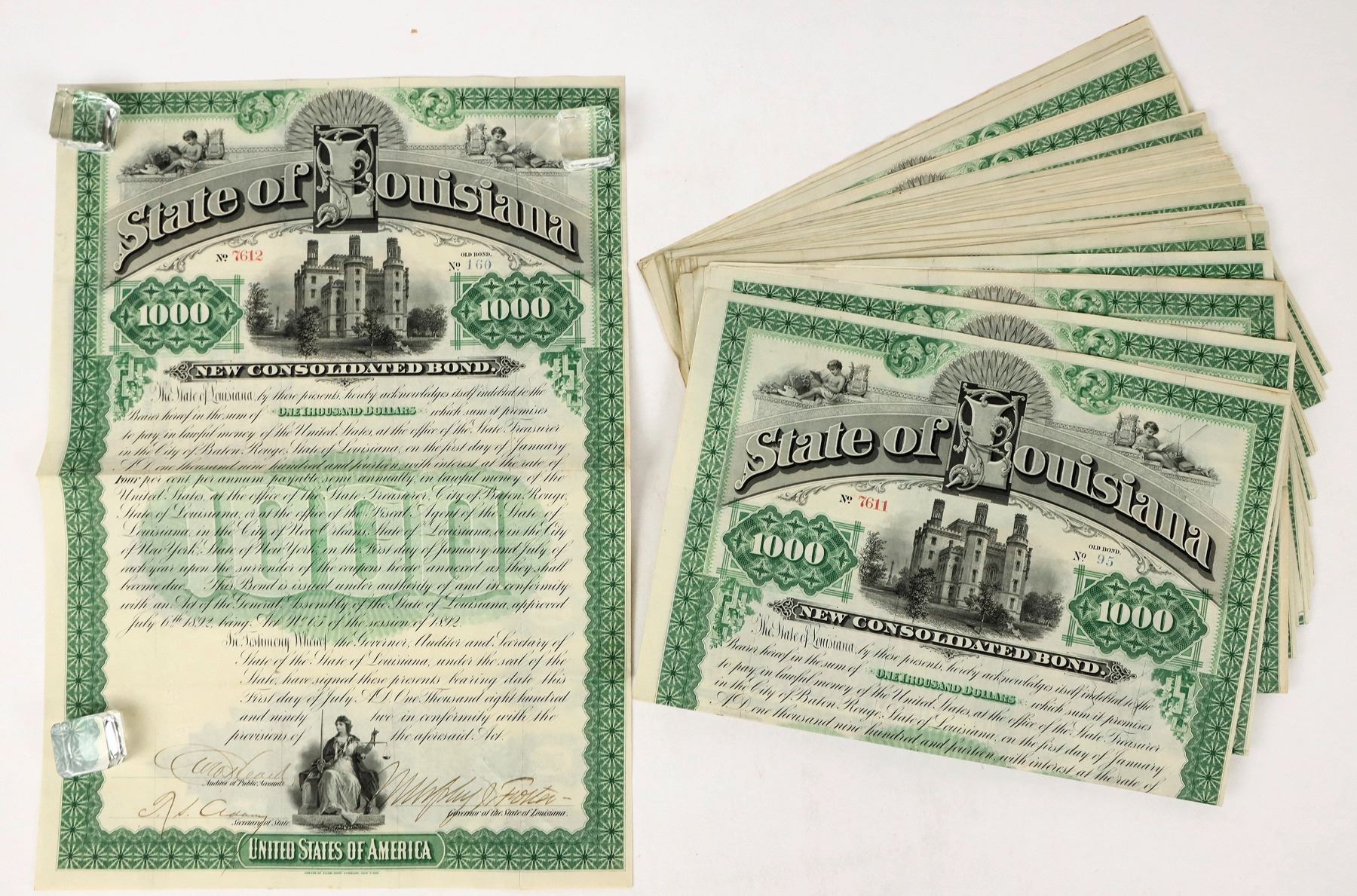27 State of Louisiana New Consolidated $1000 Bonds. All the same, some coupons attached. See photo.